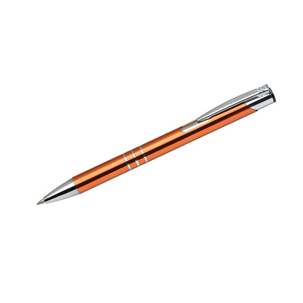 Metalowy długopis o metalizowanej chromowanej powierzchni. Długopis automatyczny z 3 ringami i niebieskim wkładem. Logo grawerujemy na powierzchni długopisu.