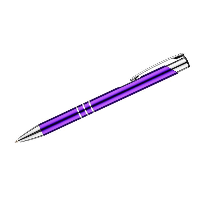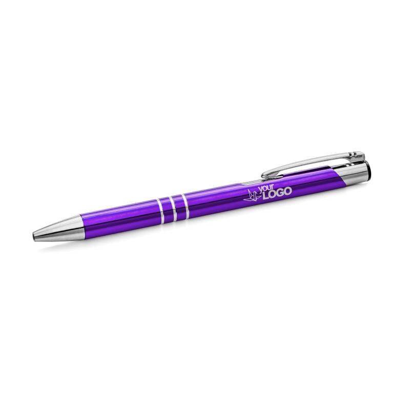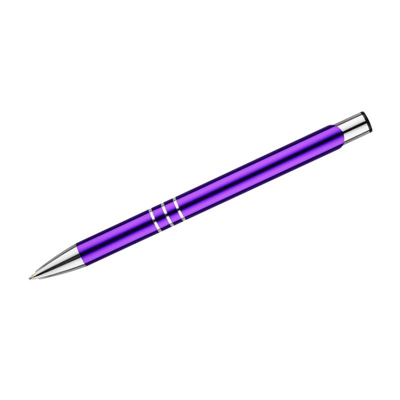 Metalowy długopis o metalizowanej chromowanej powierzchni. Długopis automatyczny z 3 ringami i niebieskim wkładem. Logo grawerujemy na powierzchni długopisu.