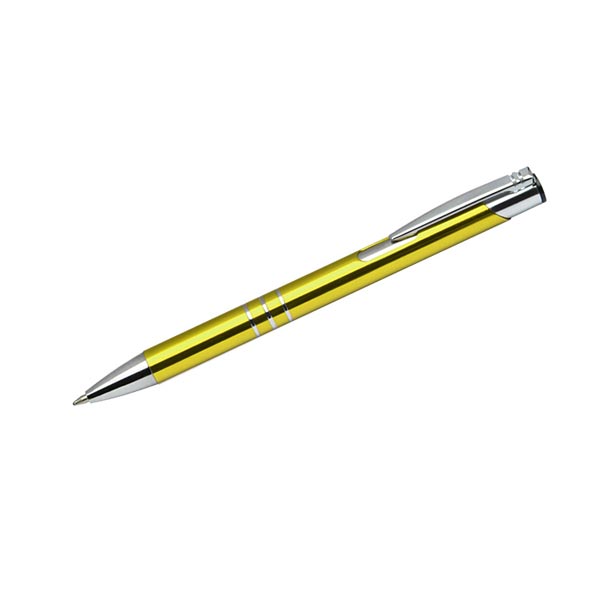 Metalowy długopis KALIPSO o metalizowanej chromowanej powierzchni. Długopis automatyczny z 3 ringami i niebieskim wkładem. Logo grawerujemy na powierzchni długopisu.
