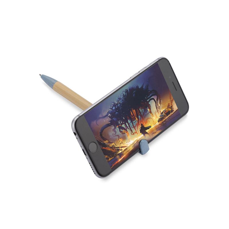 Długopis FONIK z bambusowym korpusem oraz klipem wykonanym ze słomy pszennej to praktyczny gadżet pełniący także funkcję stojaka na telefon.