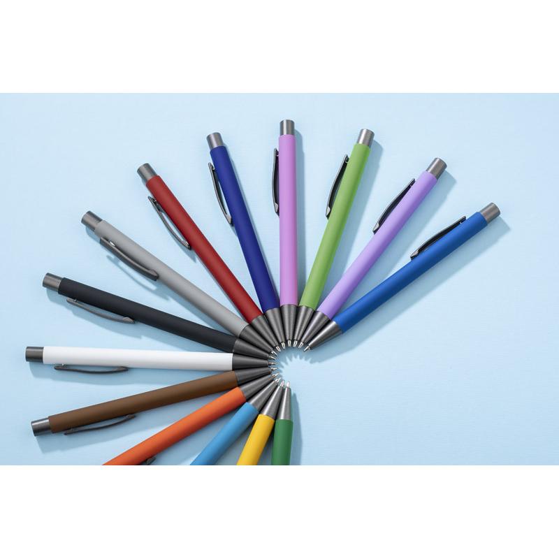Długopis GOMA to prosty design połączony z przyjemną w dotyku gumowaną powierzchnią. Całość jest utrzymana w lekkich, matowych barwach. Wykonany z aluminium. Wykończenia w kolorze grafitowym. Wkład w kolorze czarnym.