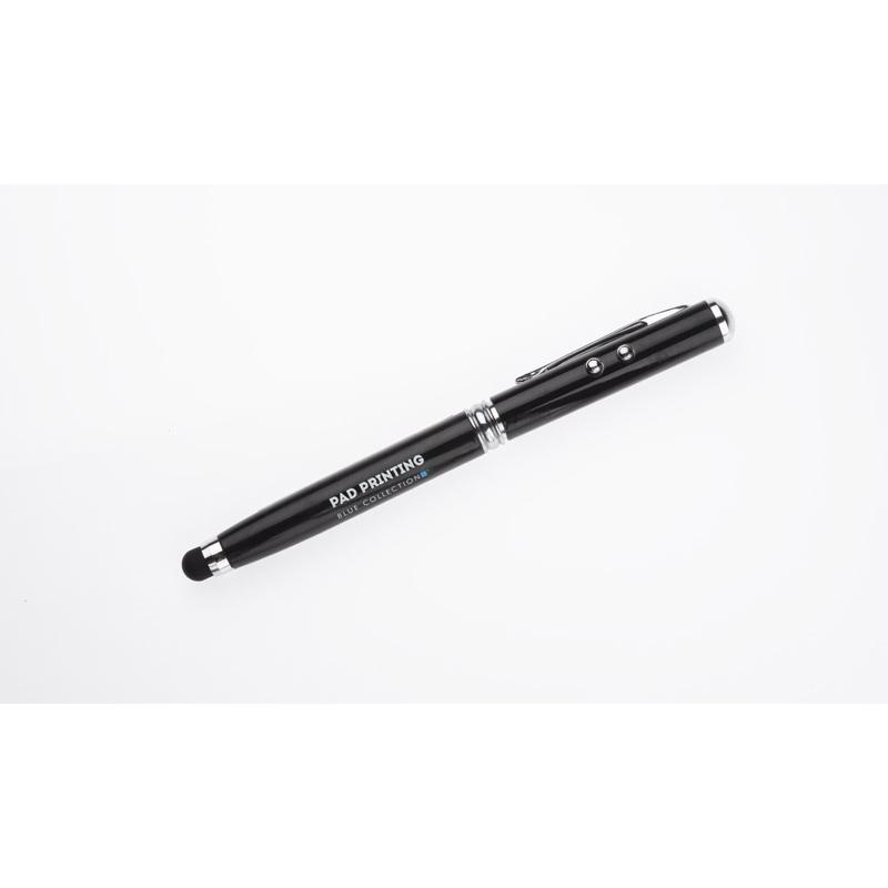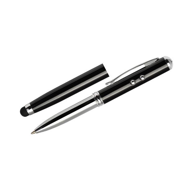 Długopis wykonany z metalu łączący aż cztery praktyczne funkcje: długopis, touch pen, wskaźnik laserowy, latarka. W jednym przyrządzie mieści się wszystko czego można potrzebować w czasie prezentacji multimedialnej lub innych biznesowych spotkań. Zgodnie z dyrektywą Unii Europejskiej (2006/25/EU) i Normą Polska ( PN-EN 60825-1:2005) wskaźnik posiada naklejkę informującą o niebezpieczeństiwe użytkowania. Logo wygrawerujemy.