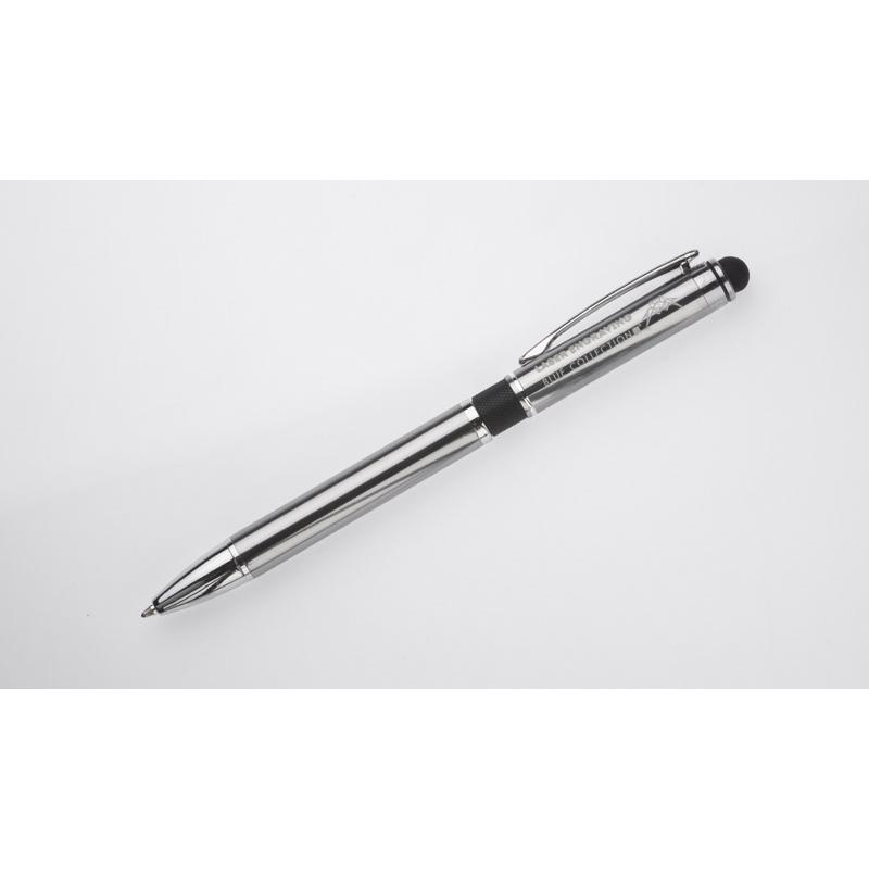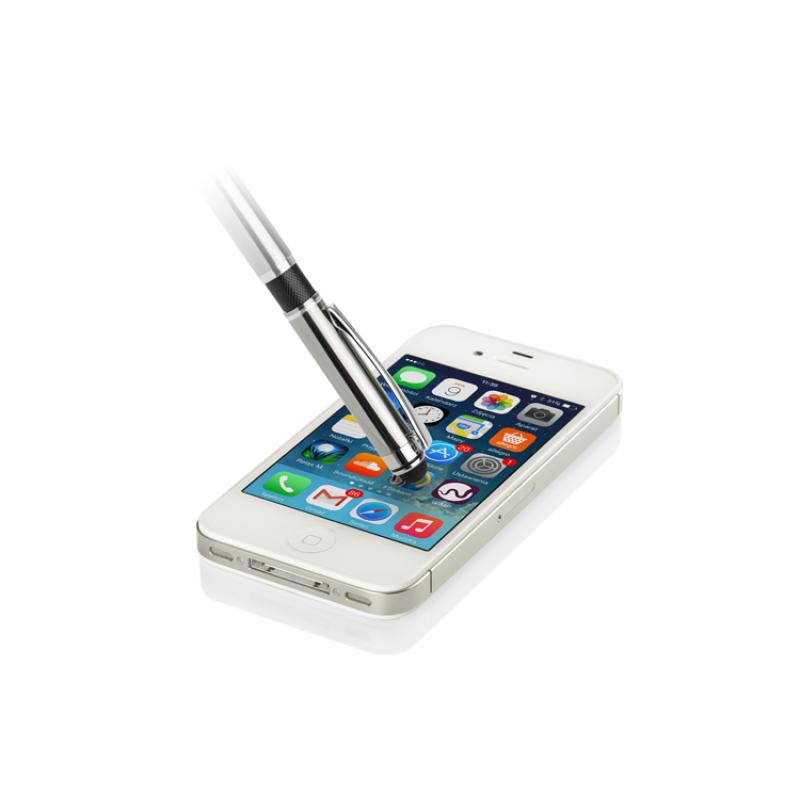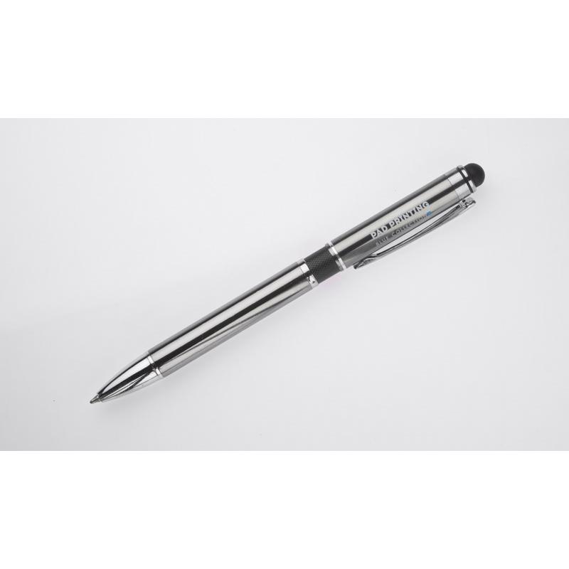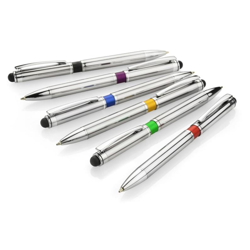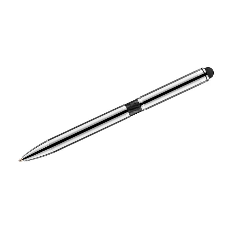 Elegancki metalowy długopis z kolorową aplikacją na korpusie oraz touchpenem.