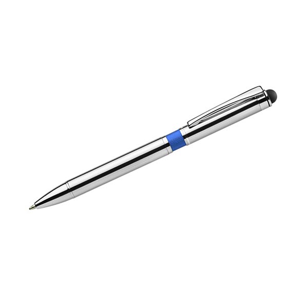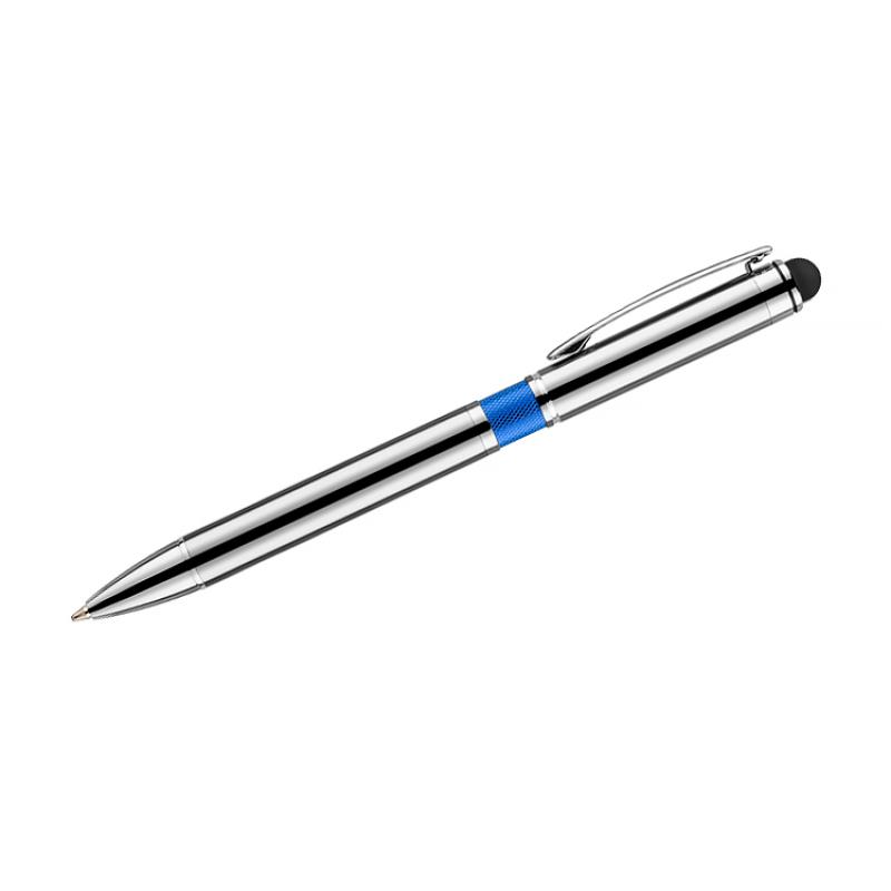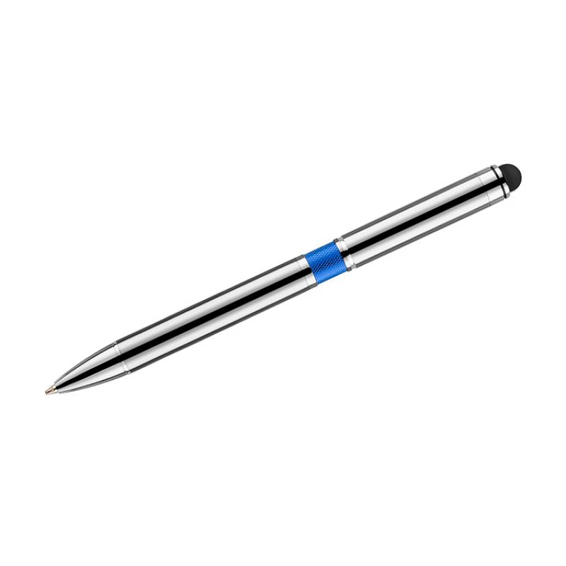 Elegancki metalowy długopis z kolorową aplikacją na korpusie oraz touchpenem.