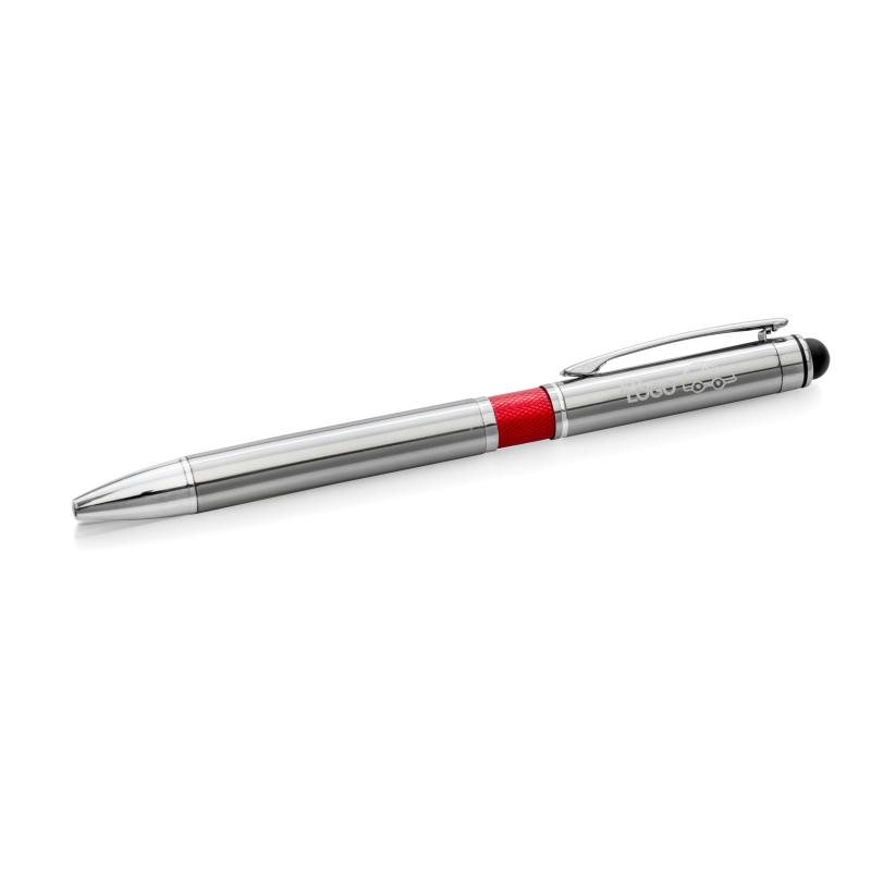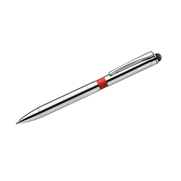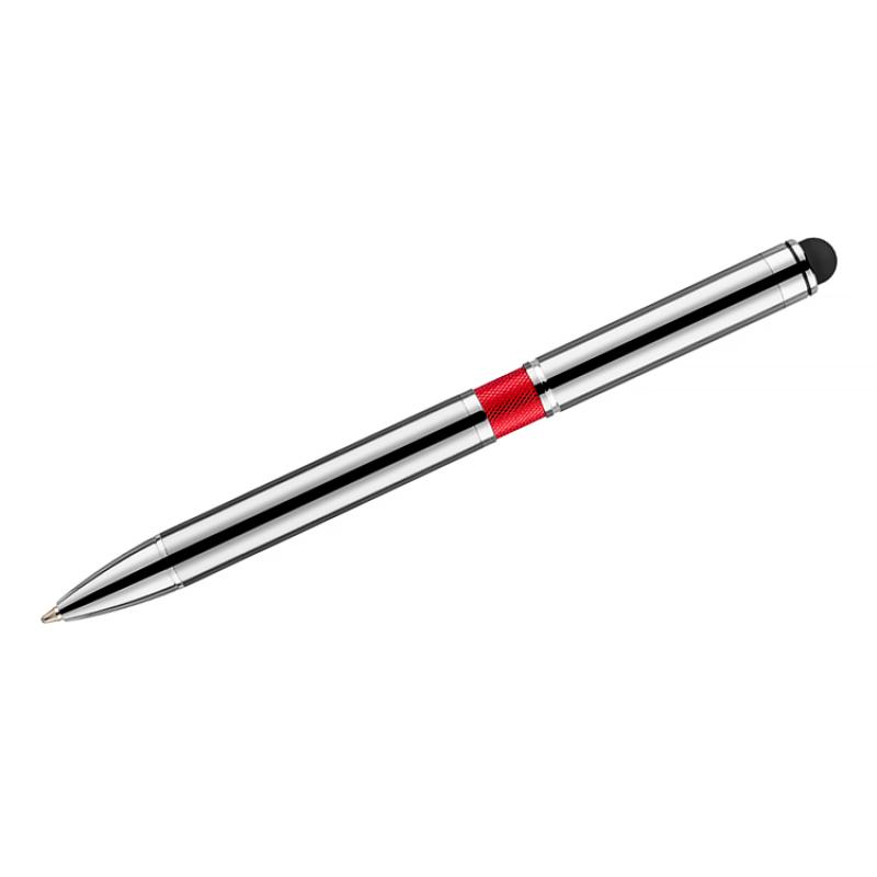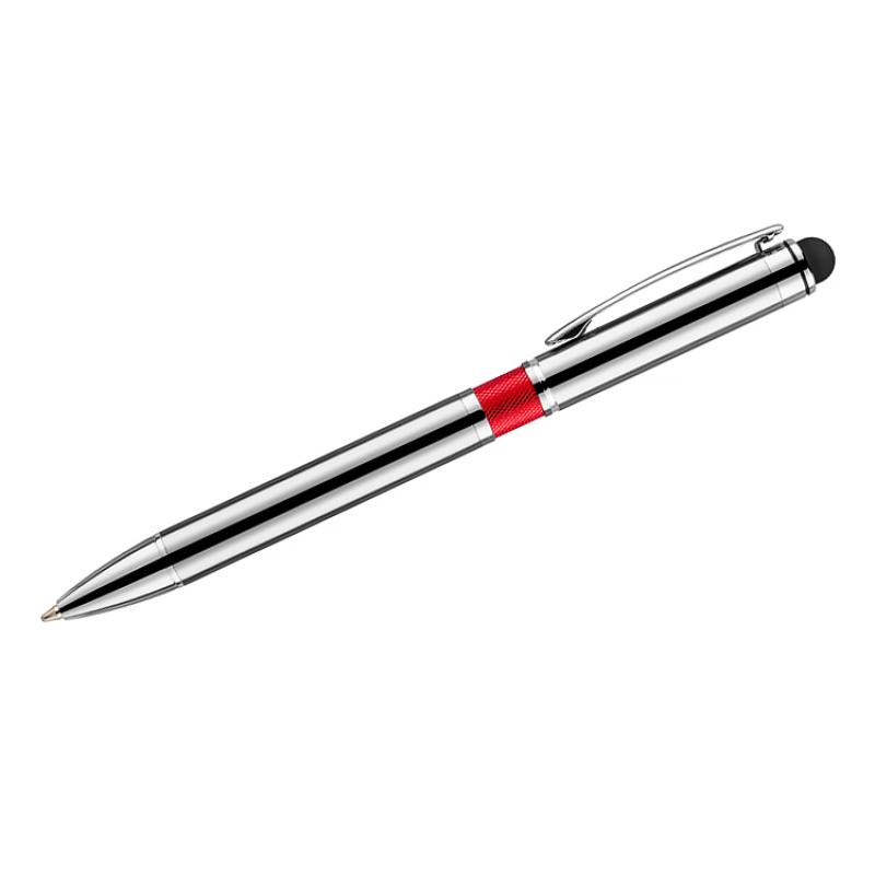 Elegancki metalowy długopis z kolorową aplikacją na korpusie oraz touchpenem.