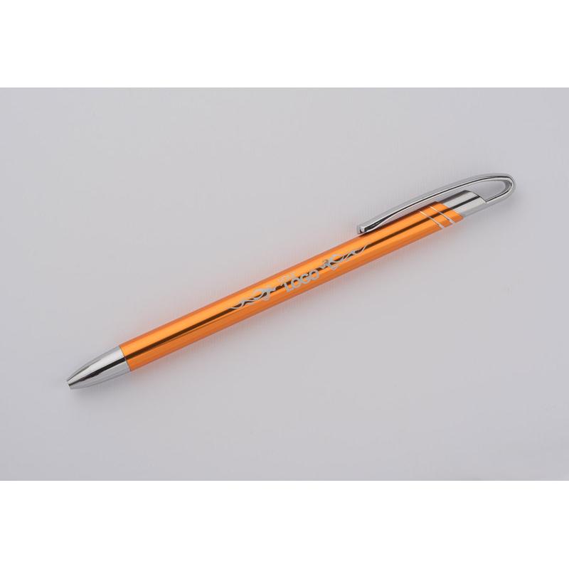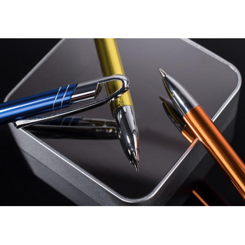 Cienki i zgrabny metalowy długopis w kolorze o metalicznym wykończeniu. Klip i końcówki w kolorze srebrnym chromowanym. AVALO wyróżnia się wśród podobnych długopisów oryginalnym projektem klipu. Korpus ozdobiony został dwoma skośnymi paskami w kolorze srebrnym. Wkład o grubości 0,7 mm w kolorze niebieskim.