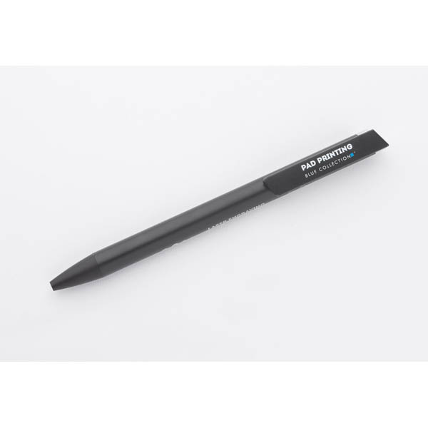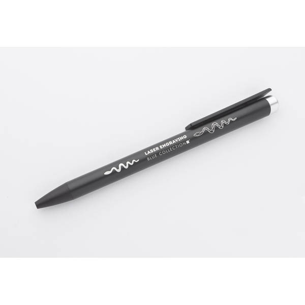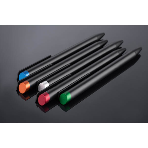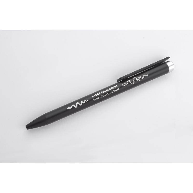 ALI to wyjątkowy długopis umożliwiający wykonanie znakowania w kolorze zbliżonym do końcówki długopisu oraz całkowicie zaskakującego grawerowania w dwóch kolorach - w kolorze zbliżonym do końcówki długopisu oraz białym (kolor aluminium). Czarny metalowy korpus oraz czarne wykończenia stanowią idealne tło dla kolorowego grawerowania. Długopis automatyczny. Wkład typu X20 o grubości 1.0 mm w kolorze niebieskim.