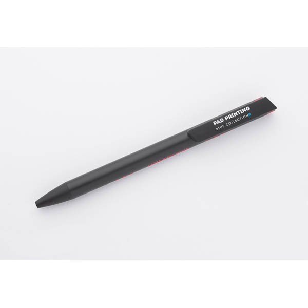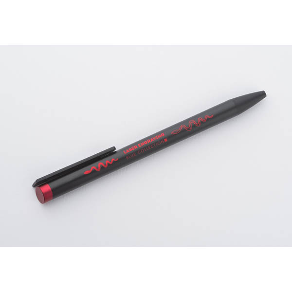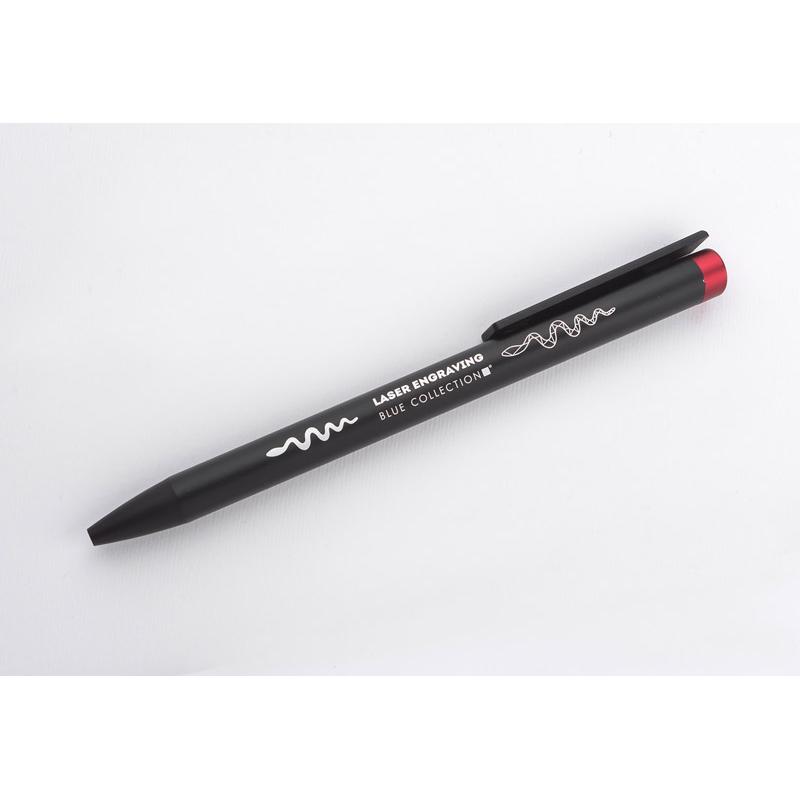 ALI to wyjątkowy długopis umożliwiający wykonanie znakowania w kolorze zbliżonym do końcówki długopisu oraz całkowicie zaskakującego grawerowania w dwóch kolorach - w kolorze zbliżonym do końcówki długopisu oraz białym (kolor aluminium). Czarny metalowy korpus oraz czarne wykończenia stanowią idealne tło dla kolorowego grawerowania. Długopis automatyczny. Wkład typu X20 o grubości 1.0 mm w kolorze niebieskim.