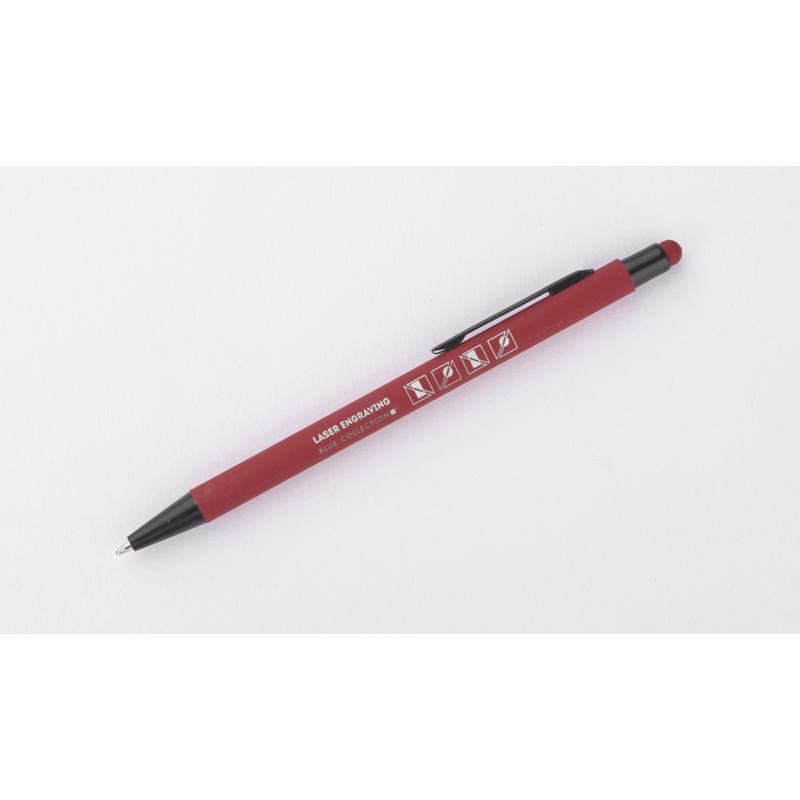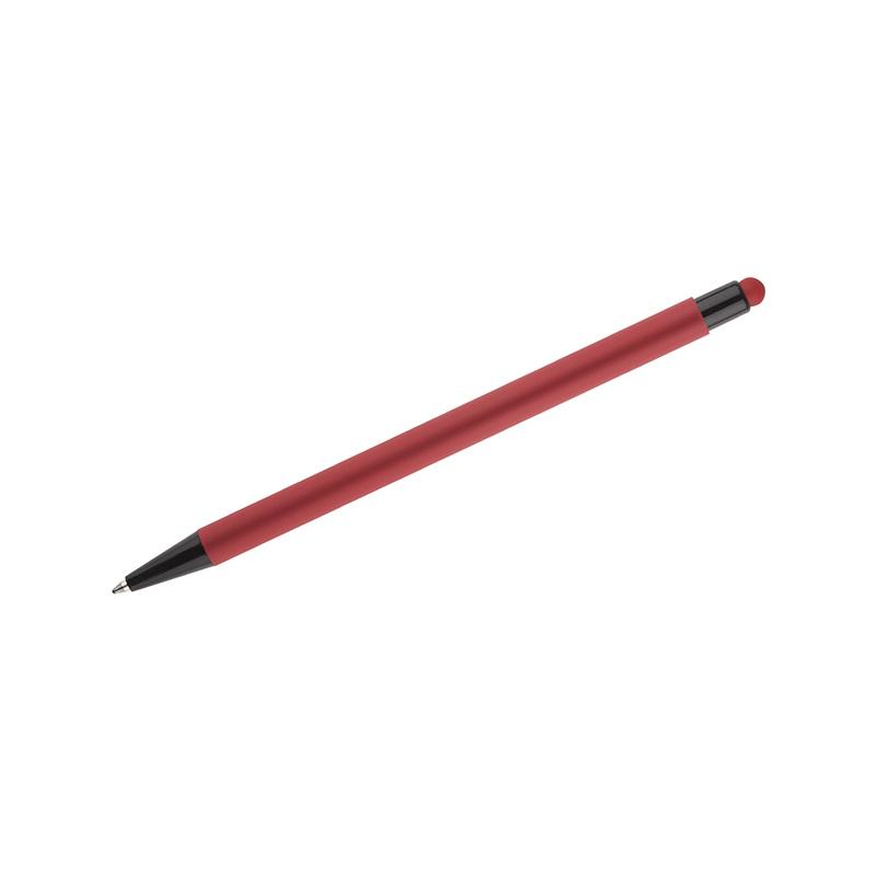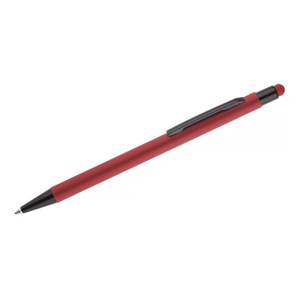 Klasyczny, cienki długopis PRIM wykonany z aluminium pokrytego gumowaną powłoką typu soft touch. Na górze końcówka do obsługi ekranów dotykowych w kolorze dopasowanym do korpusu długopisu. Wykończenia w kolorze czarnym. Długopis automatyczny. Wkład typu X20 w kolorze niebieskim.