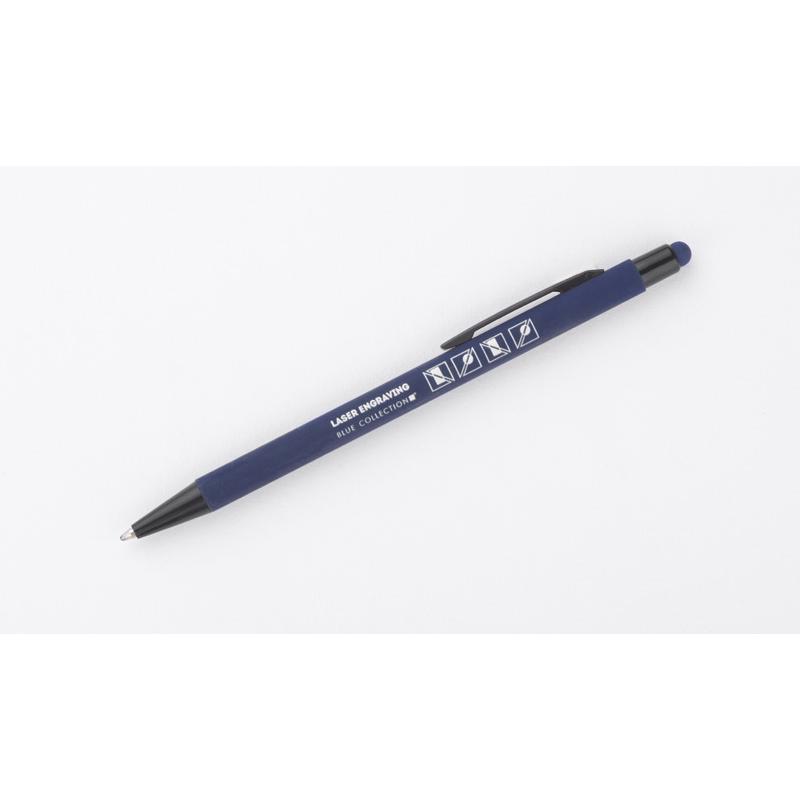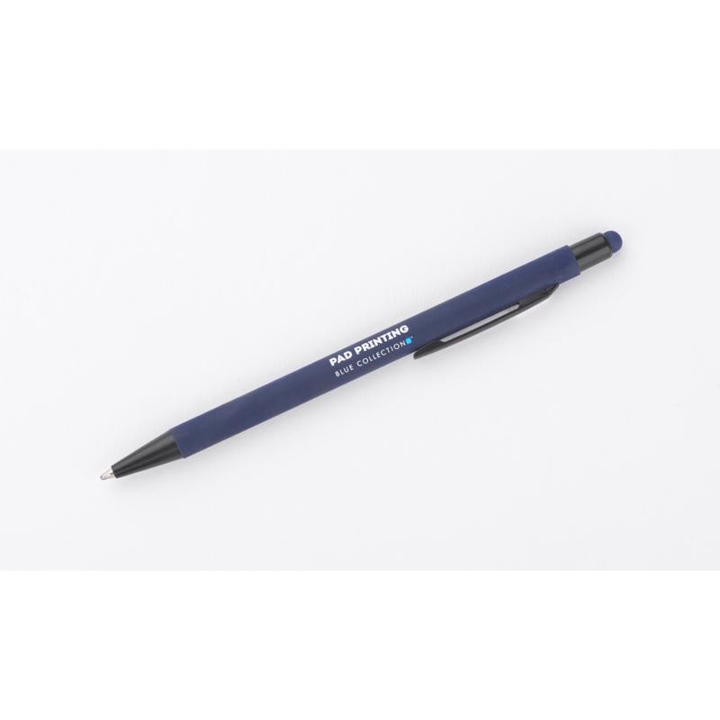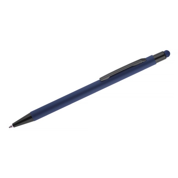 Klasyczny, cienki długopis PRIM wykonany z aluminium pokrytego gumowaną powłoką typu soft touch. Na górze końcówka do obsługi ekranów dotykowych w kolorze dopasowanym do korpusu długopisu. Wykończenia w kolorze czarnym. Długopis automatyczny. Wkład typu X20 w kolorze niebieskim.