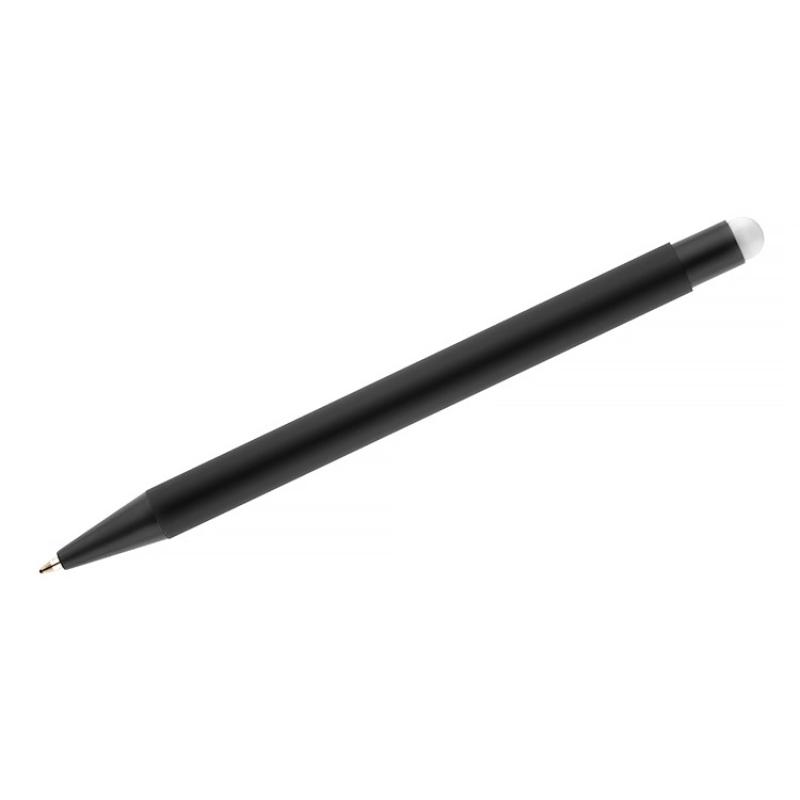 NIRO to długopis z wyjątkowym efektem znakowania. Kolor grawera jest zbliżony do koloru końcówki touch do obsługi ekranów dotykowych. Korpus wykonany z aluminium pokrytego gumowaną powłoką typu soft touch. Wykończenia w kolorze czarnym. Długopis automatyczny. Wkład typu G2 w kolorze niebieskim.