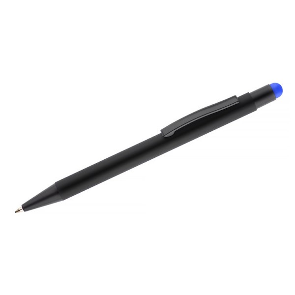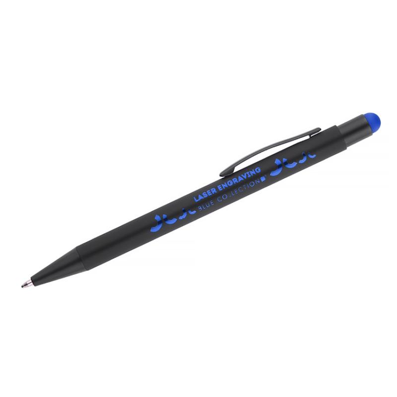 NIRO to długopis z wyjątkowym efektem znakowania. Kolor grawera jest zbliżony do koloru końcówki touch do obsługi ekranów dotykowych. Korpus wykonany z aluminium pokrytego gumowaną powłoką typu soft touch. Wykończenia w kolorze czarnym. Długopis automatyczny. Wkład typu G2 w kolorze niebieskim.