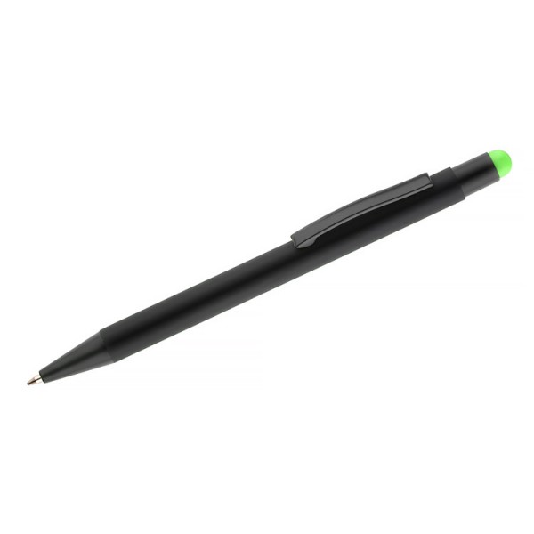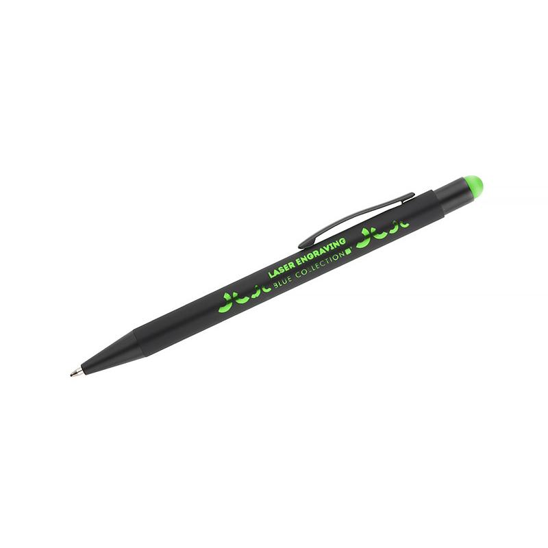 NIRO to długopis z wyjątkowym efektem znakowania. Kolor grawera jest zbliżony do koloru końcówki touch do obsługi ekranów dotykowych. Korpus wykonany z aluminium pokrytego gumowaną powłoką typu soft touch. Wykończenia w kolorze czarnym. Długopis automatyczny. Wkład typu G2 w kolorze niebieskim.
