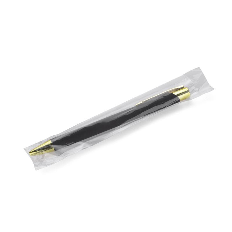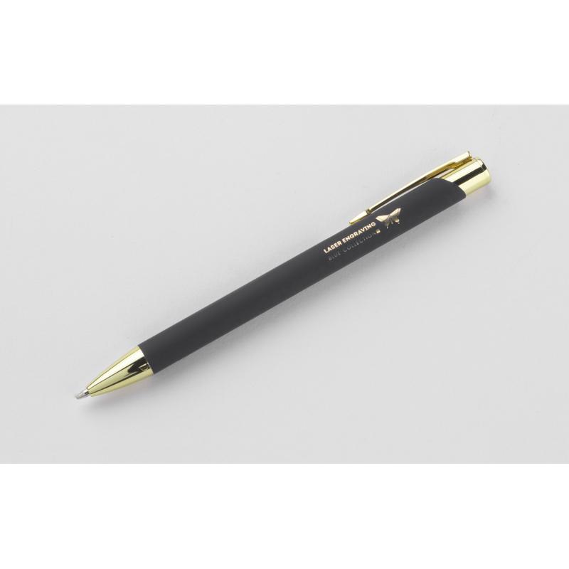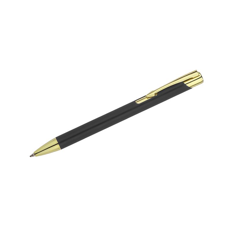 GOLDEN to długopis wyróżniający się przyjemną w dotyku gumowaną powierzchnią oraz wyjątkowo eleganckimi złotymi wykończeniami. Korpus wykonany z aluminium. Możliwość wygrawerowania logo w kolorze złotym, które doskonale pasuje do wykończeń długopisu. Długopis automatyczny. Wkład typu G2 w kolorze niebieskim.
