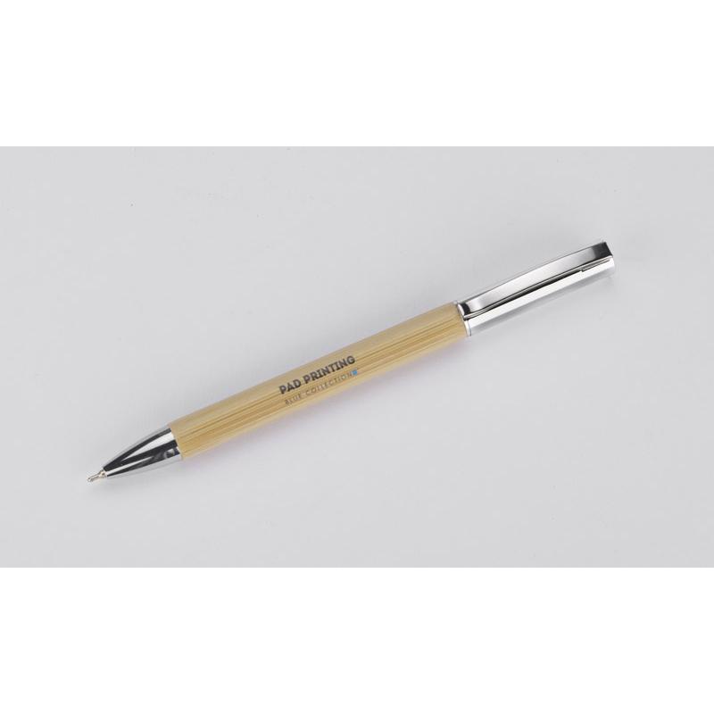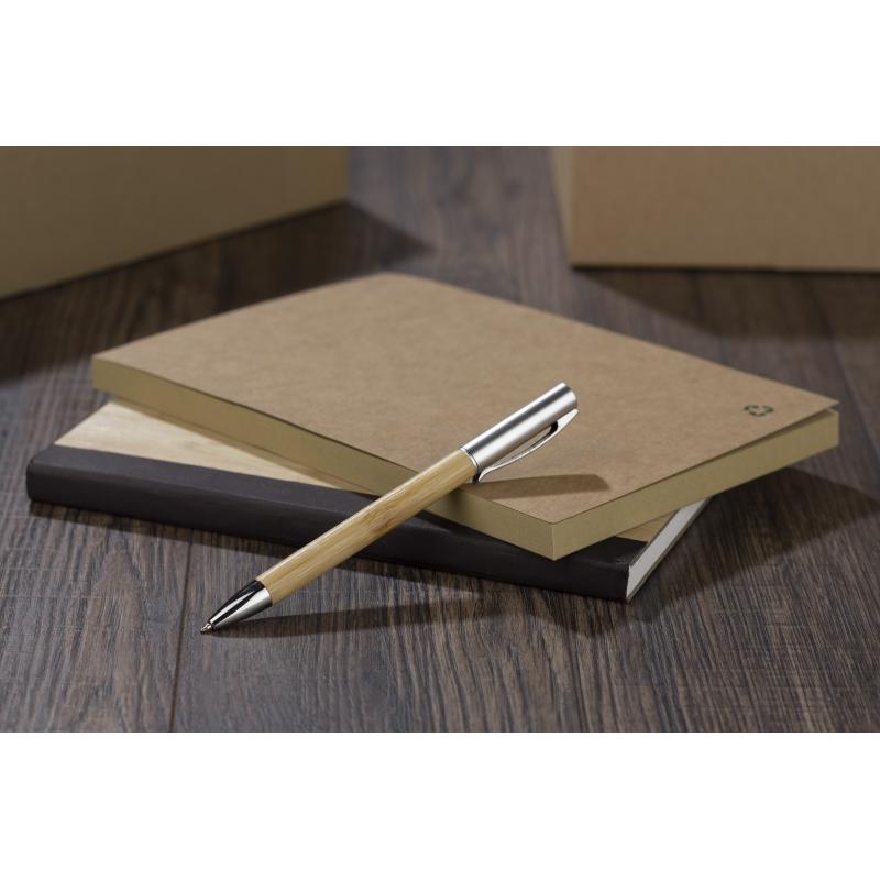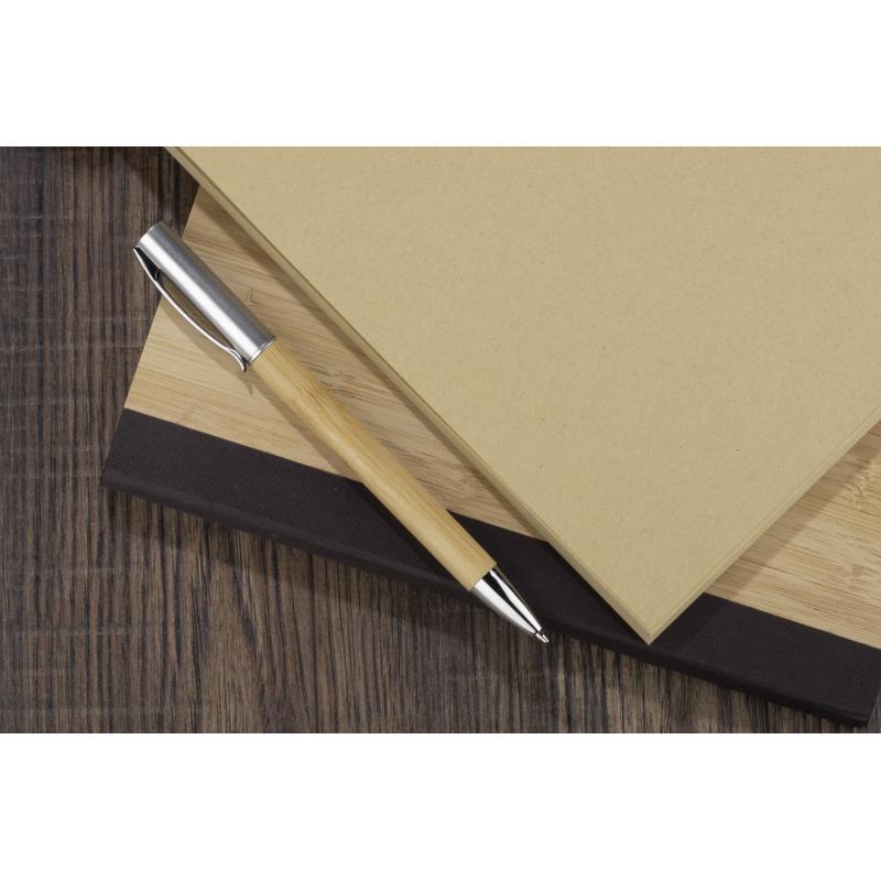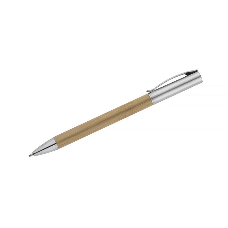 Elegancki długopis z bambusowym korpusem. Długopis jest wykończony metalowym klipsem i elementami w kolorze srebrnym.