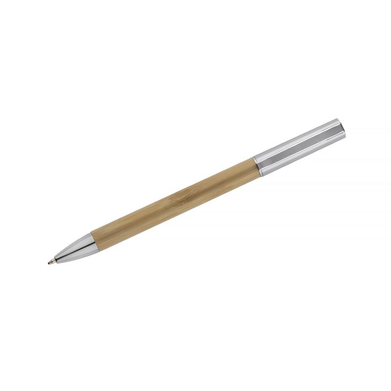 Elegancki długopis z bambusowym korpusem. Długopis jest wykończony metalowym klipsem i elementami w kolorze srebrnym.