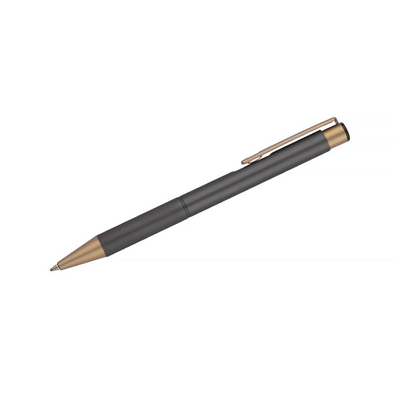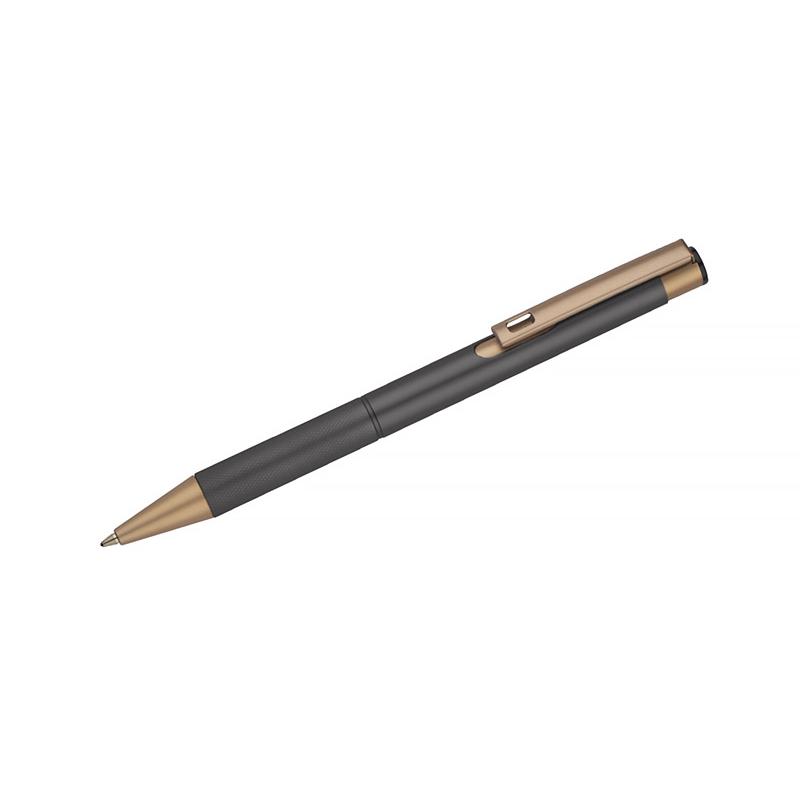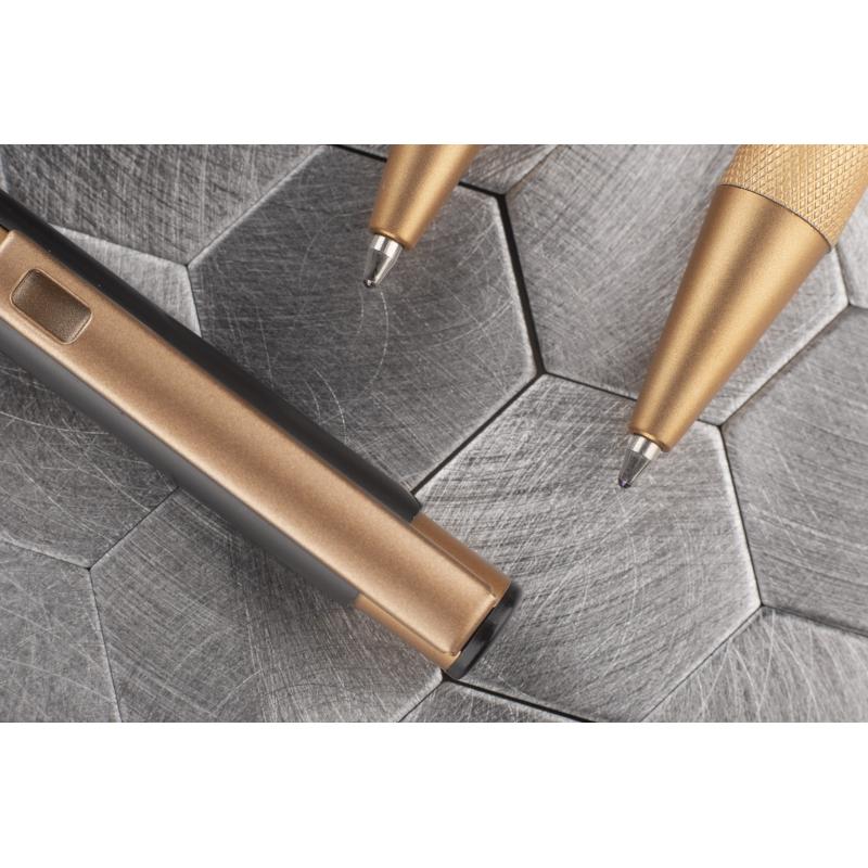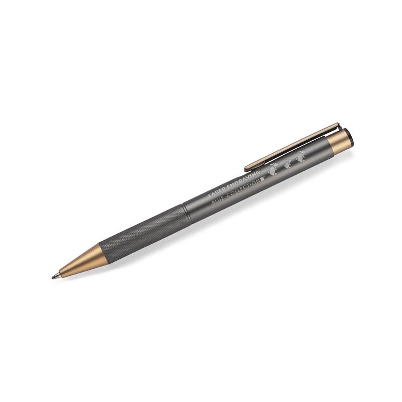 Elegancki aluminiowy długopis. Wykończenia w kolorze złotym. Wkład półżelowy w kolorze niebieskim.