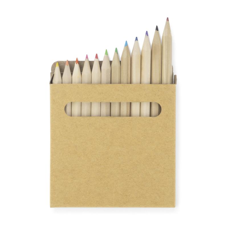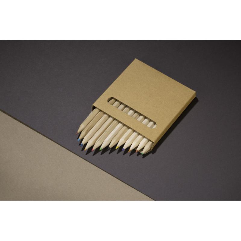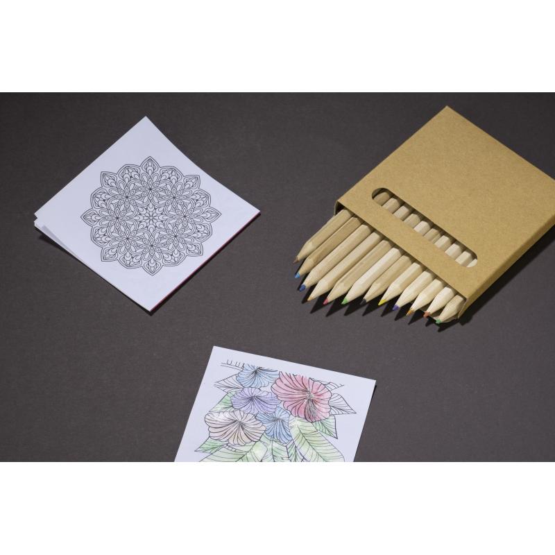 Zestaw składa się z kredek w 12 kolorach, 12 stron z kolorowanką. Wszystko zapakowane w niewielkich rozmiarów papierowy kartonik