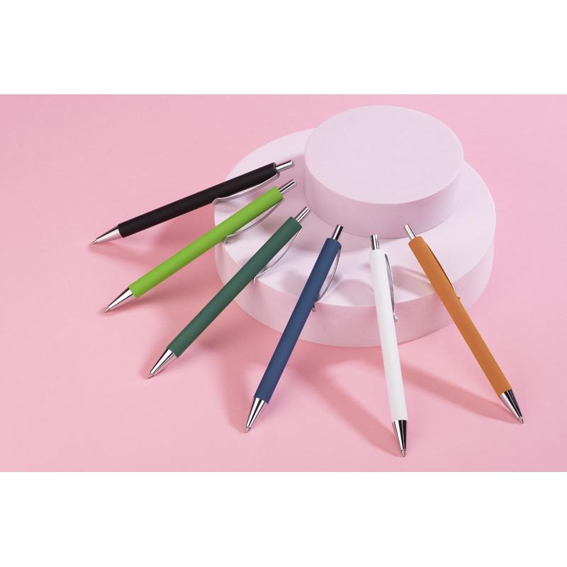 Długopis NOVI wykończony przyjemną w dotyku gumowaną powierzchnią z chromowanymi elemantami w kolorze srebrnym. Wkład w kolorze niebieskim.
