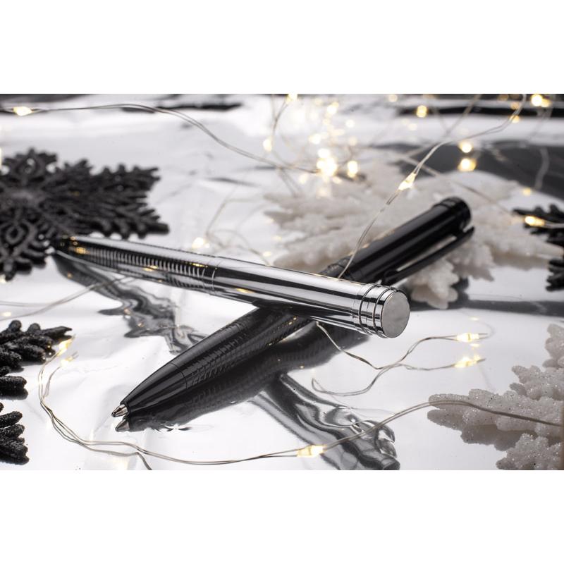 Długopis FIL to symbol solidności, elegancji i wyrafinowanego stylu. Wykonany z najwyższej jakości metalu, długopis zapewnia niezrównaną trwałość i niezawodność, nawet przy intensywnym codziennym użytkowaniu. Unikalny wzór na korpusie dodaje mu niepowtarzalnego uroku, a praktyczny klips umożliwia bezpieczne przenoszenie długopisu w kieszeni czy notesie. Górna część korpusu została zaprojektowana z myślą o personalizacji, co czyni go doskonałym narzędziem promocyjnym. Długopis posiada obrotowy mechanizm wysuwania wkładu.