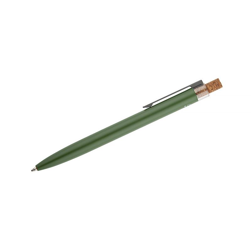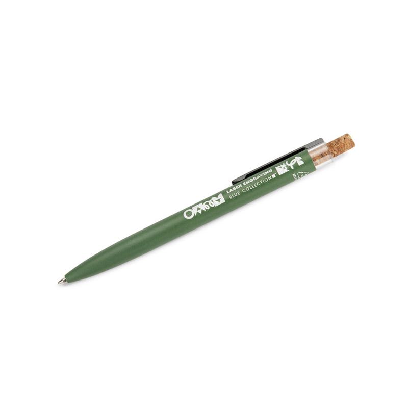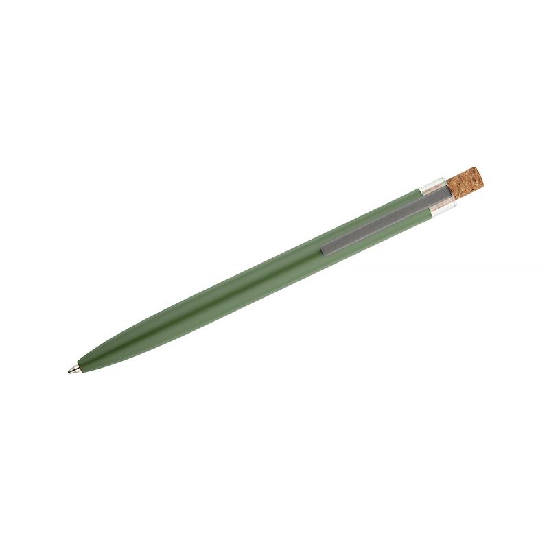 Długopis KORIN wykonany jest z recyklingowanego aluminium i pokryty lakierowanym wykończeniem, które nadaje mu gładką, satynową powierzchnię. Wyposażony w automatyczny mechanizm, wkład typu G2 o grubości pisania 1,0 mm oraz metalowy klips w kolorze grafitowym. Korkowy przycisk stanowi ciekawy akcent, podkreślający nowoczesny charakter długopisu. KORIN jest lekki, solidny i wygodny w codziennym użytkowaniu.