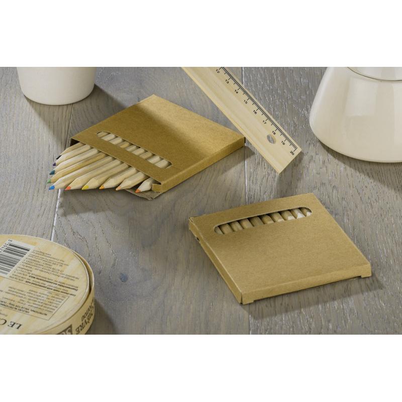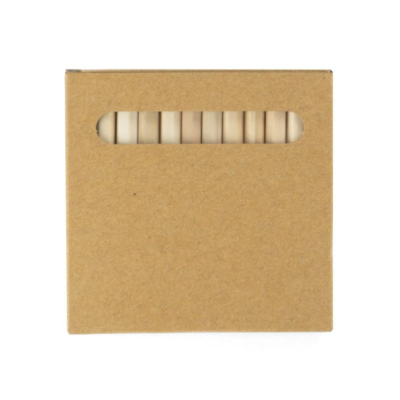 Drewniane kredki w dwunastu kolorach. Zapakowane w poręczny kartonik z okienkiem. Logo nadrukujemy na kartoniku.