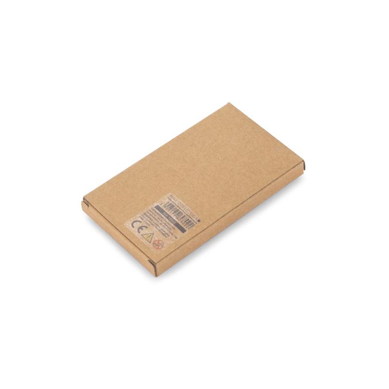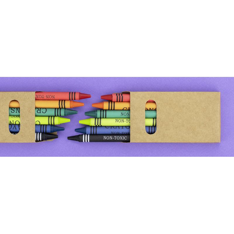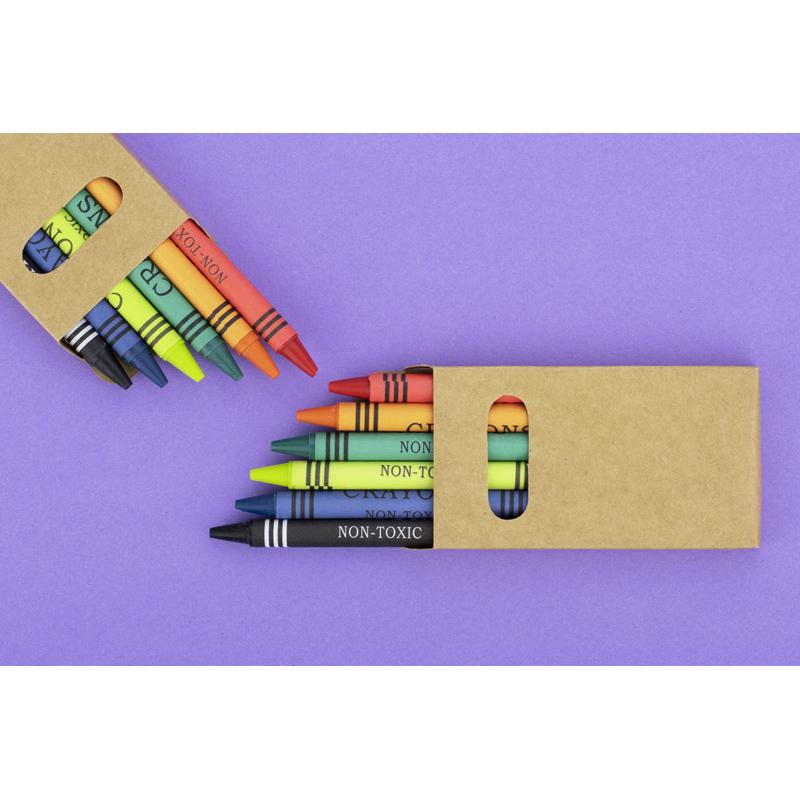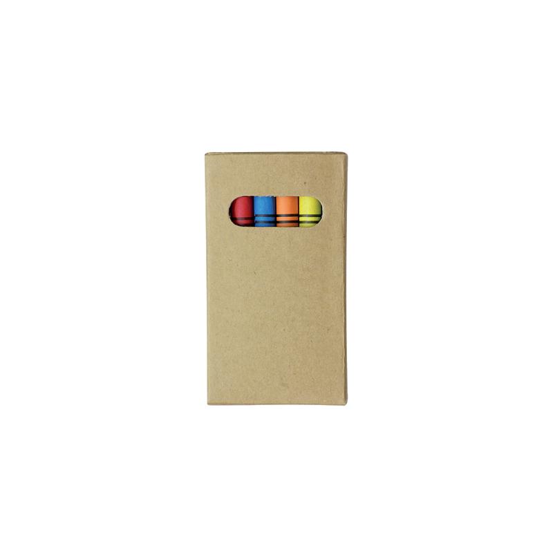 Kredki świecowe w sześciu kolorach, zapakowane w ekologiczny kartonik z okienkiem. Logo nadrukujemy na kartoniku.