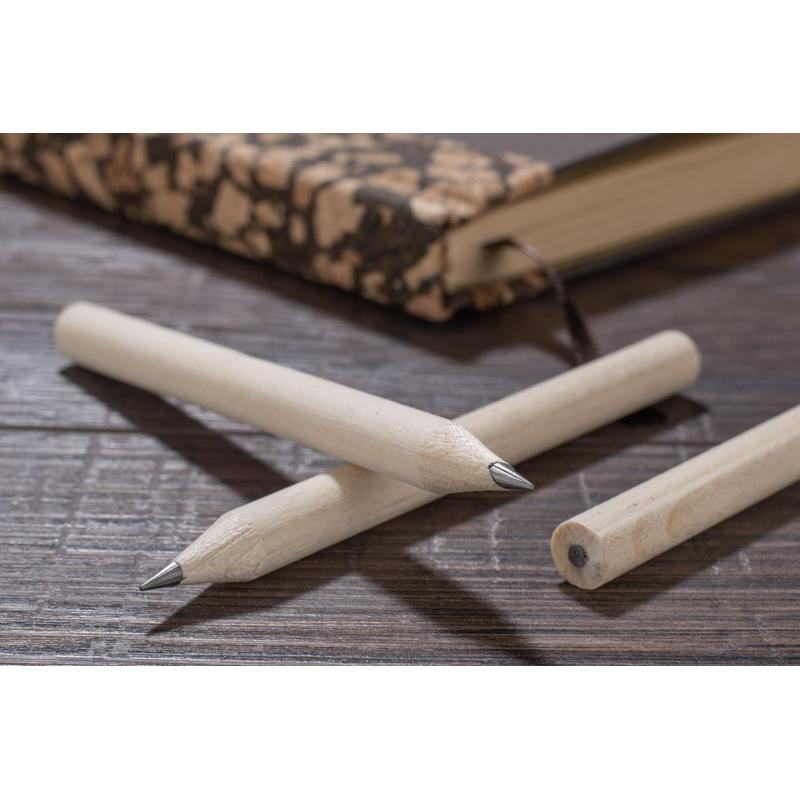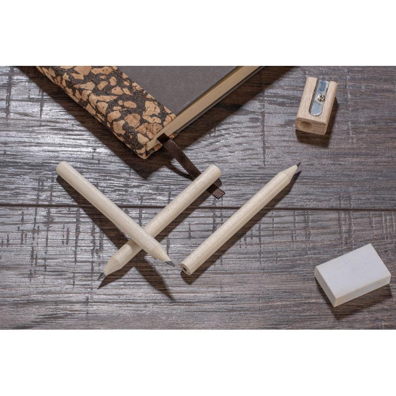 Krótki, drewniany ołówek IKKO z szeroką możliwością znakowania. Długość 8,5 cm. Ołówek zatemperowany.