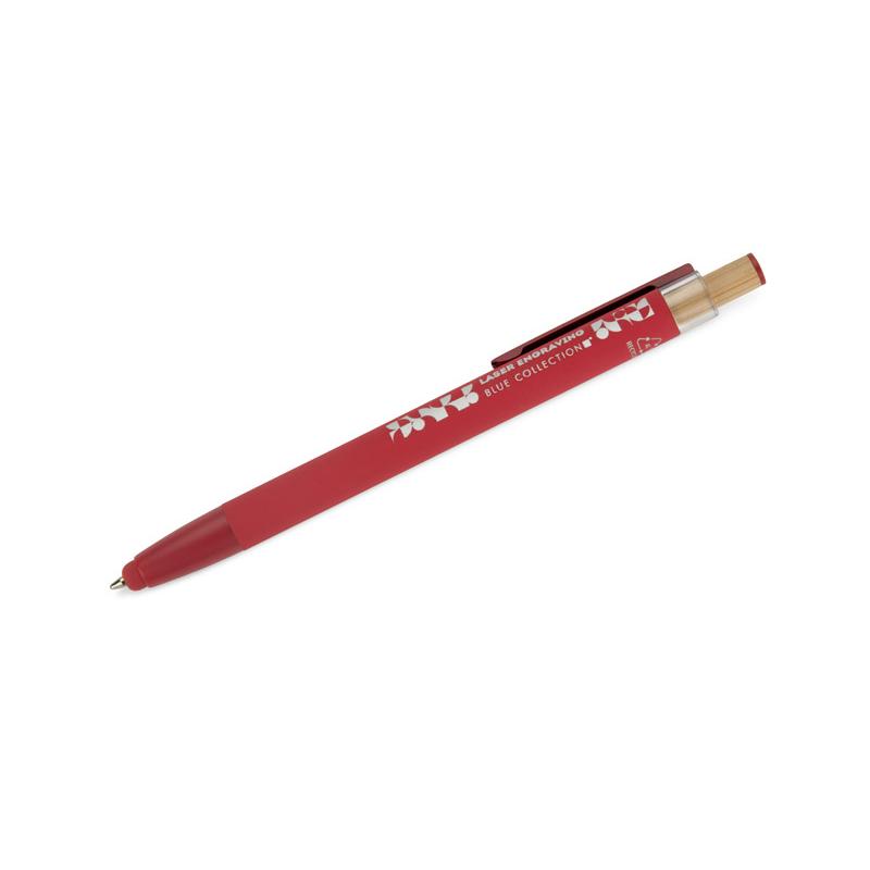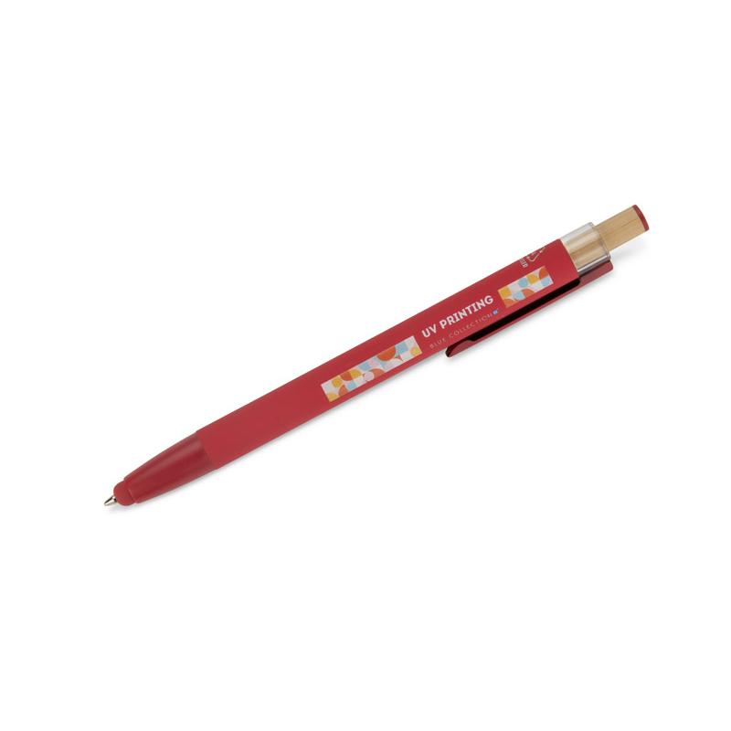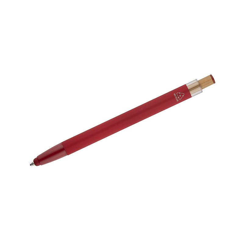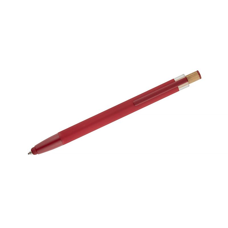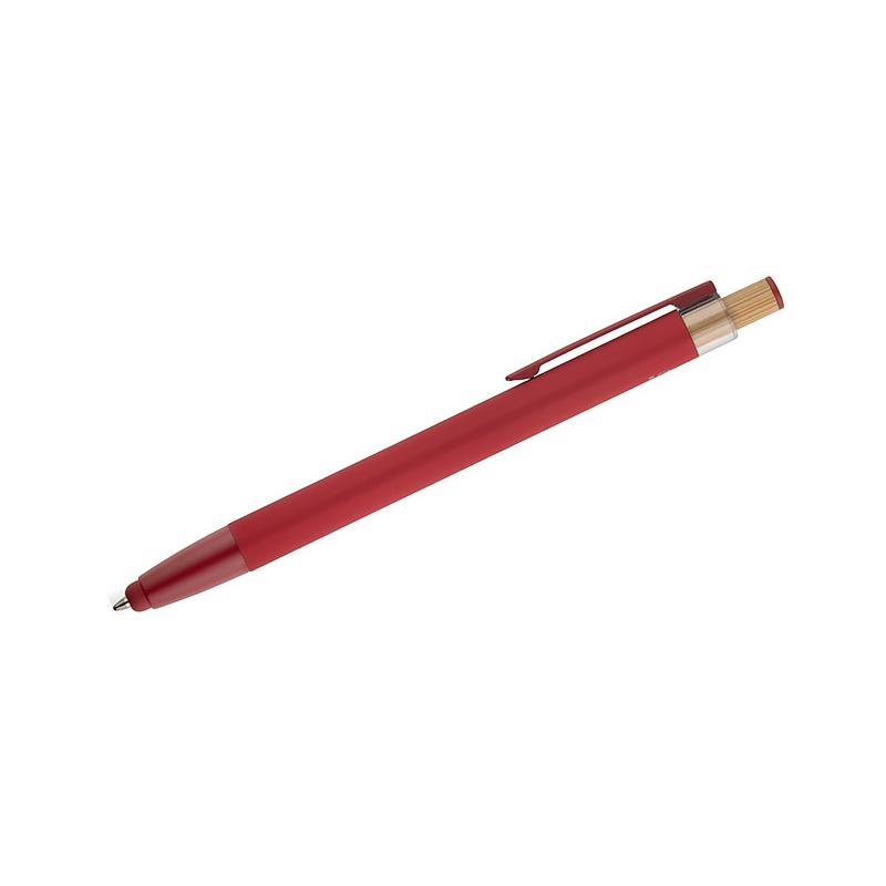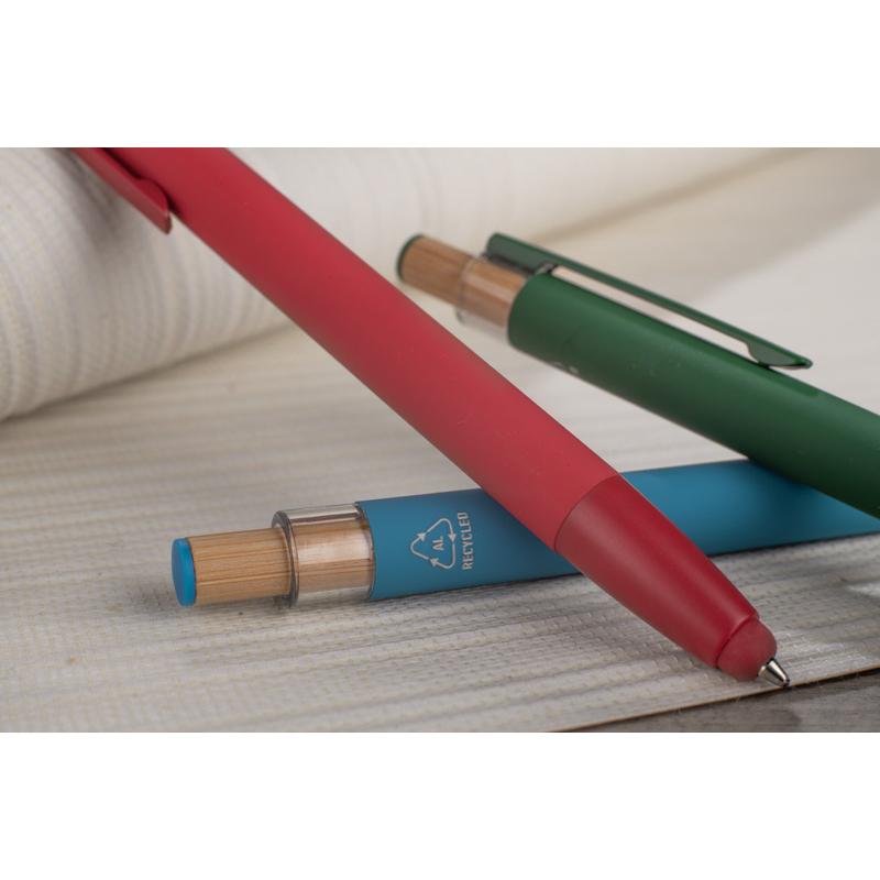 Długopis ALPEN to połączenie nowoczesnego designu i wygody pisania. Wykonany z recyklingowanego aluminium z miękkim w dotyku, gumowanym wykończeniem typu soft touch, zapewnia komfortowe użytkowanie każdego dnia. Wyposażony jest w funkcję touch pena do obsługi ekranów dotykowych oraz metalowy klip, który ułatwia przypięcie do notesu lub kieszeni. Charakterystyczny guzik z bambusa dodaje całości naturalnego akcentu, a kolorowe detale podkreślają jego nowoczesny styl. Wkład typu G2 o grubości linii 1,0 mm gwarantuje płynne pisanie i wysoką trwałość.