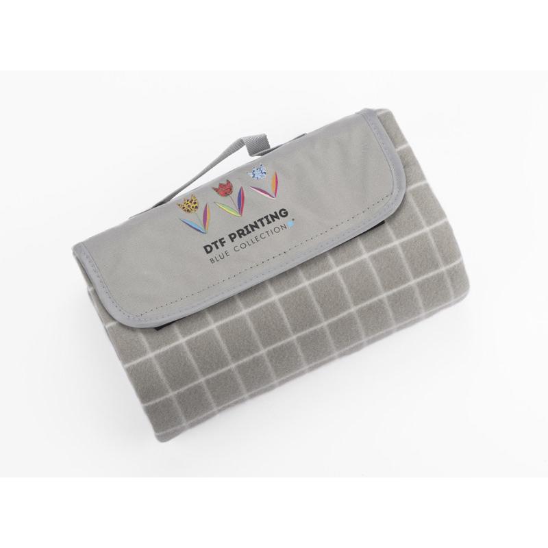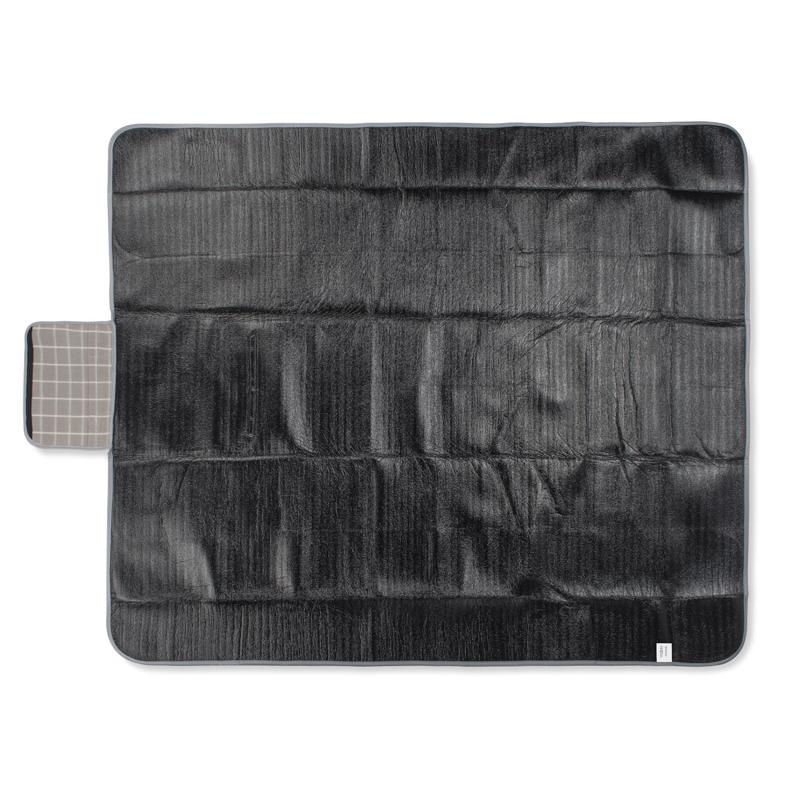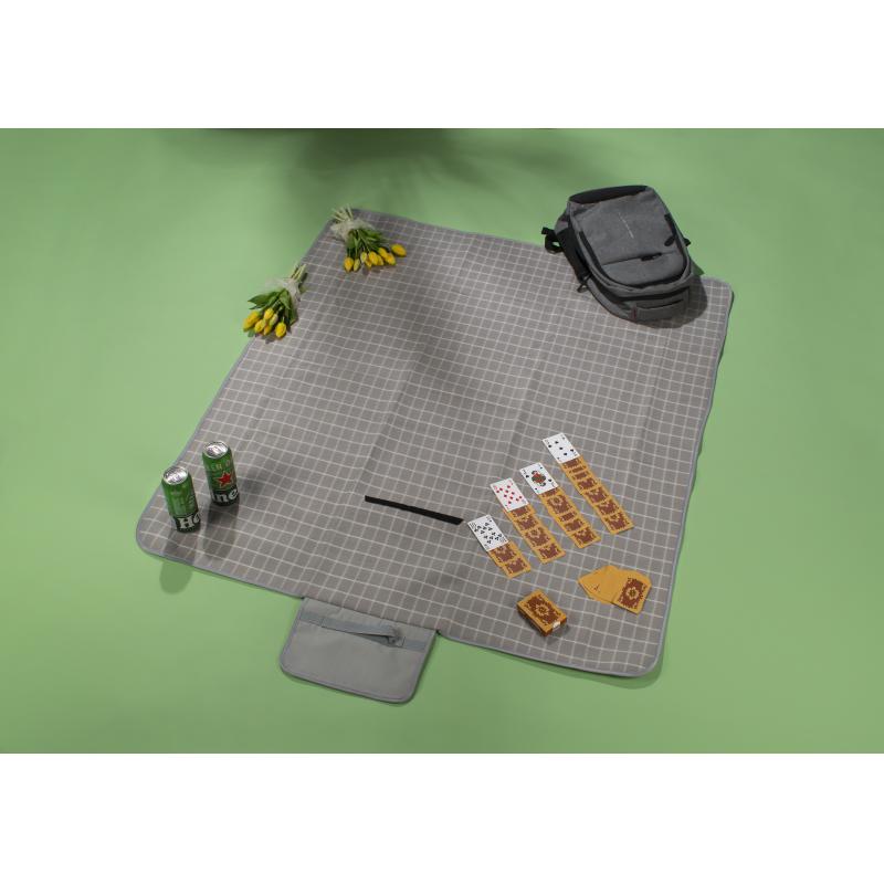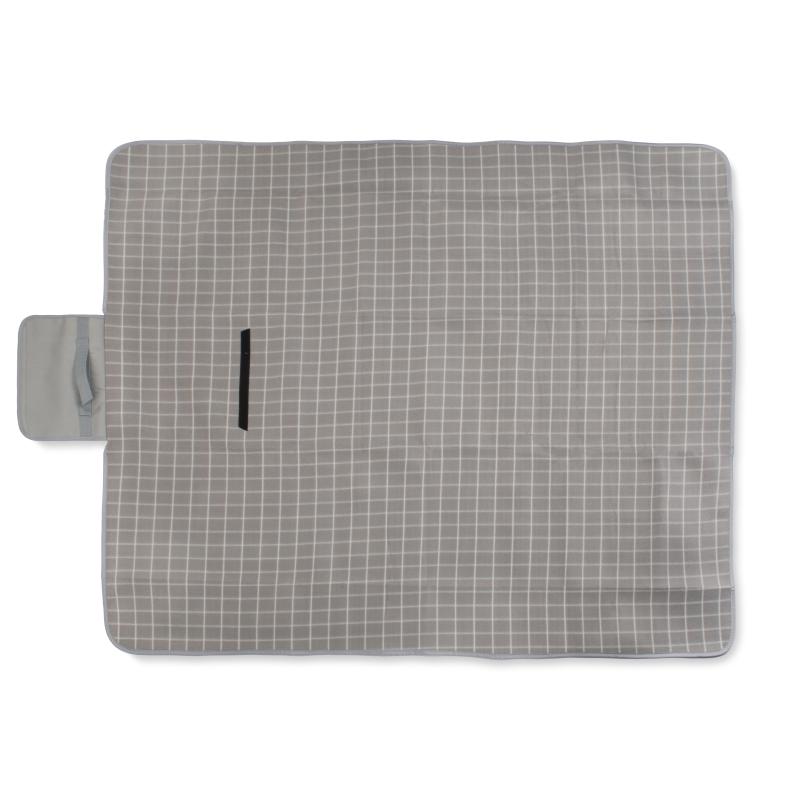 Koc piknikowy wykonany z gładkiego polaru w klasyczny wzór w kratę. Od spodu posiada wodoodporną warstwę PET. Po złożeniu klapa zapinana na rzep.