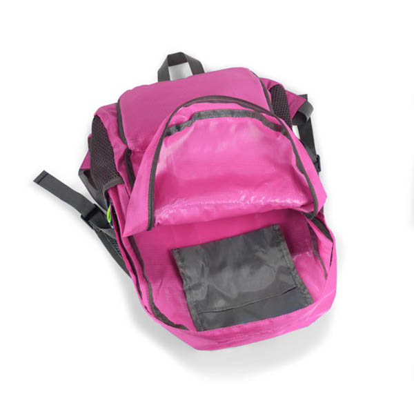 Funkcjonalny plecak, który można złożyć do niewielkich rozmiarów. Posiada jedną wewnętrzną kieszeń oraz trzy zewnętrzne - jedną zapinaną na zamek oraz dwie siateczkowe. Plecak wykonany z poliestru.