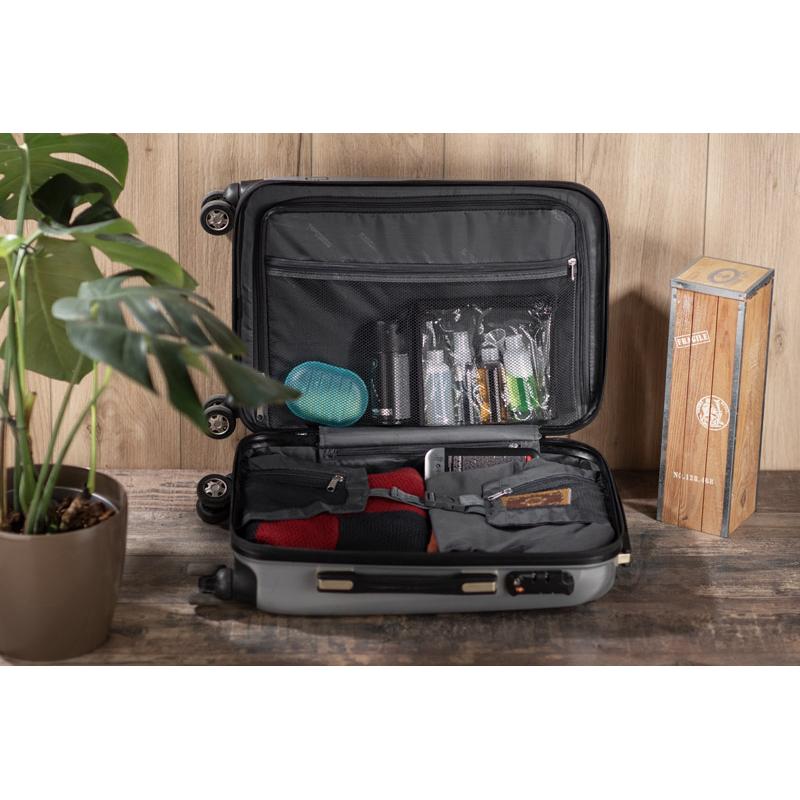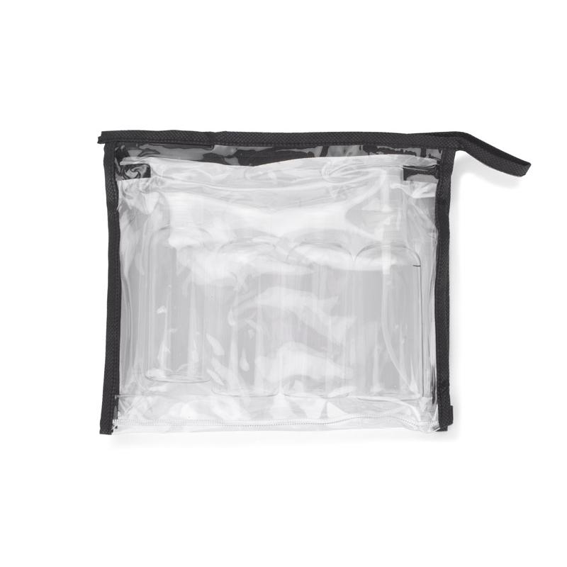 Zestaw podróżnych pojemników to gadżet przydatny w czasie podróży. Pozwala na zabranie swoich ulubionych kosmetyków w mniejszych buteleczkach. Zestaw zawiera 4 buteleczki o pojemności 80 ml, w tym jedną ze spryskiwaczem oraz lejek ułatwiający przelewanie kosmetyków.