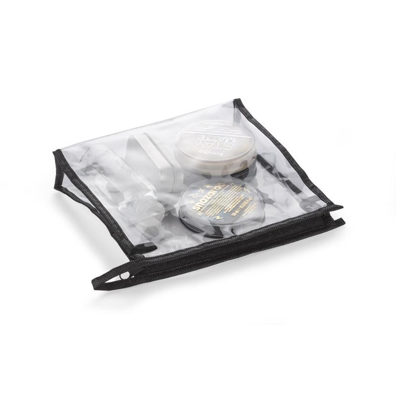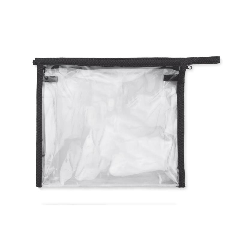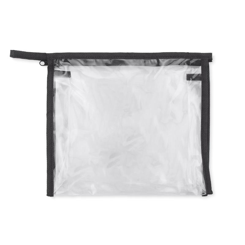 Przezroczysta kosmetyczka na zamek błyskawiczny. Wykonana z PVC i polipropylenu non-woven. Świetnie nada się jako torebka na płyny do bagażu podręcznego.