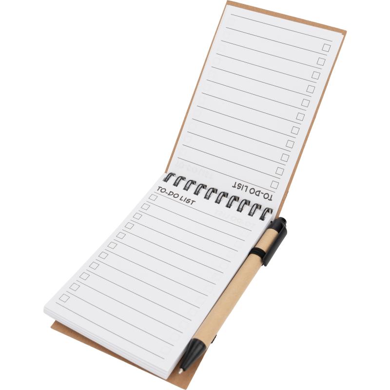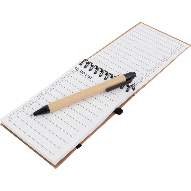 Ekologiczny notes (70 stron w linie z listą rzeczy do zrobienia, gramatura papieru 70g/m²) na spirali w komplecie z długopisem.