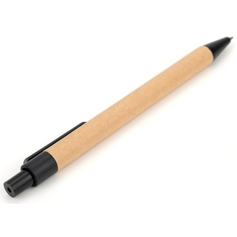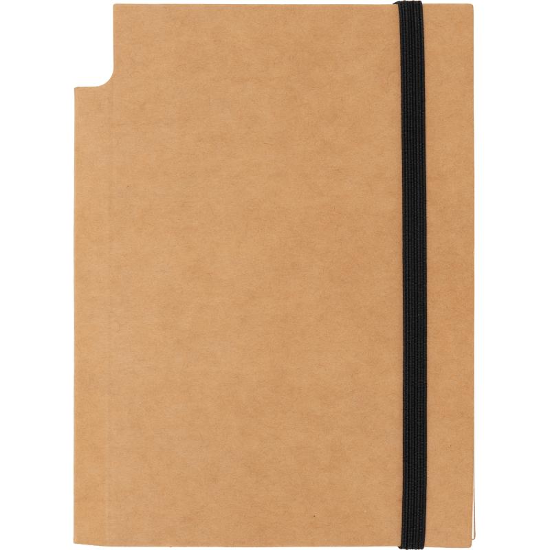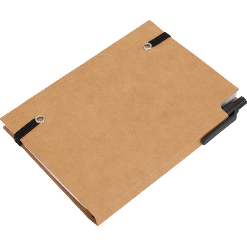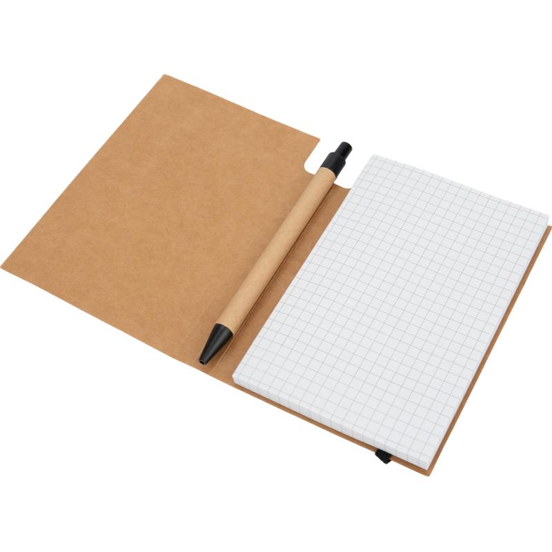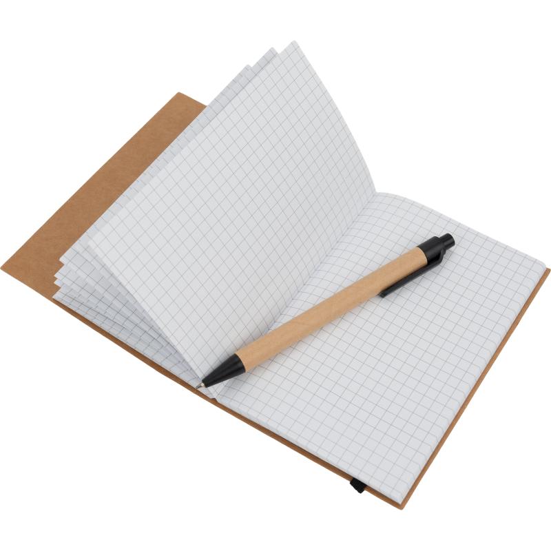 Mały notes (160 stron w kratkę) z ekologiczną okładką z kartonu i gumką do zamykania. W zestawie z długopisem.