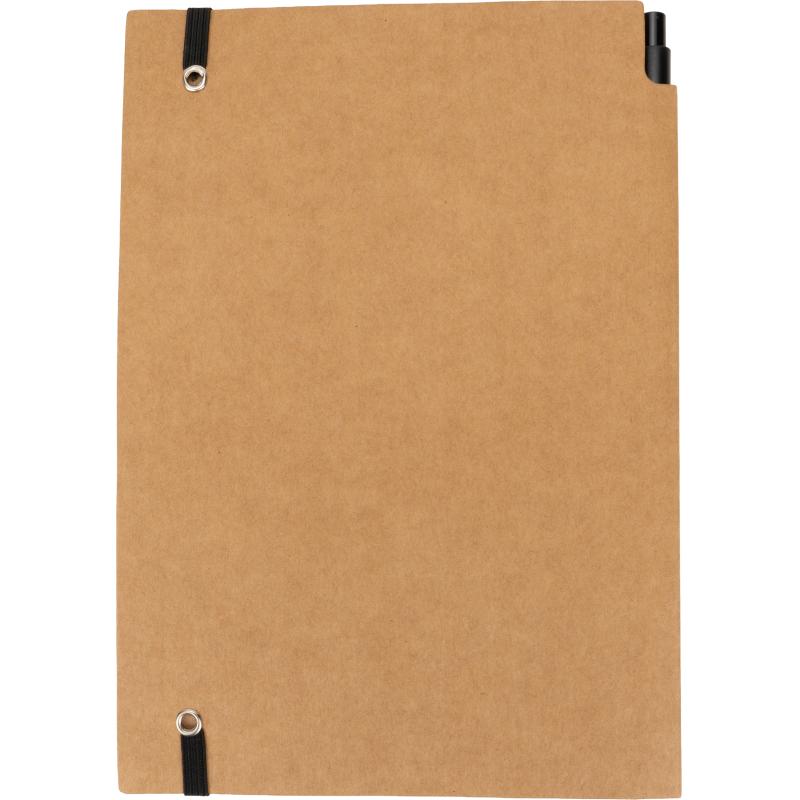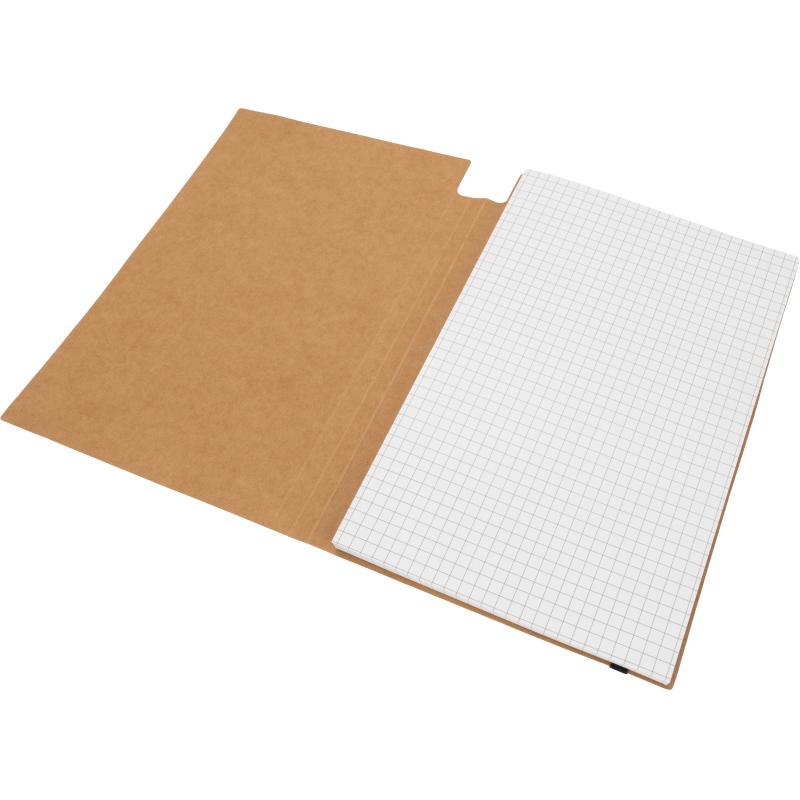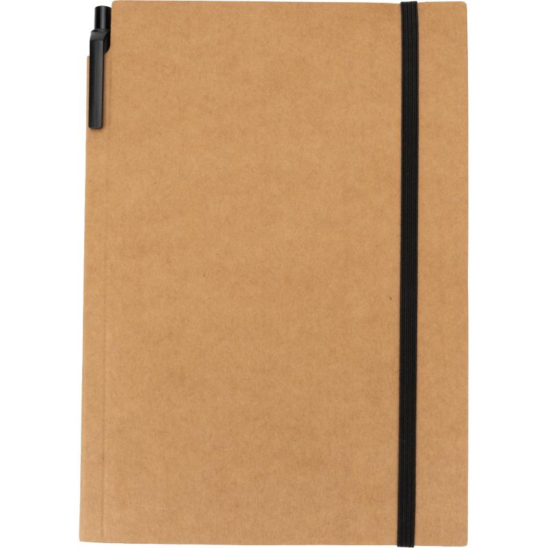 Notes (160 stron w kratkę) z ekologiczną okładką z kartonu i gumką. W zestawie z długopisem.