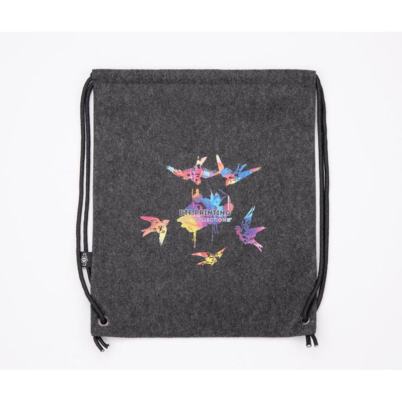 Worek DENGY wykonany z recyklingowanego filcu rPET w grafitowym, neutralnym kolorze. W połączeniu z czarnymi sznureczkami i uchwytem prezentuje się niezwykle ciekawie.