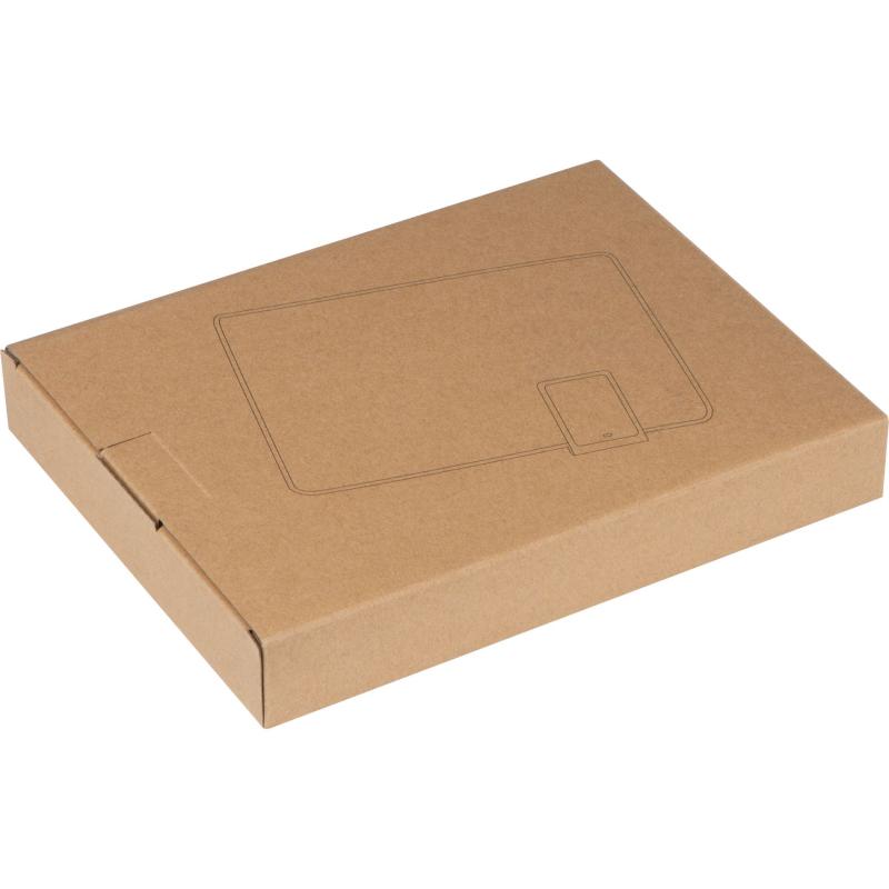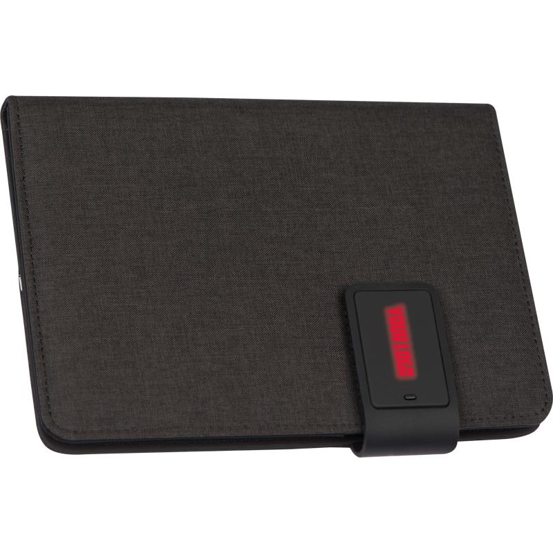 Notatnik formatu A5, z kartkami w linię, z wbudowanym power bankiem o pojemności 4000 mAh, kablem, kieszonkami i miejscem na telefon. Zamykanie magnetyczne, na którym można umieścić logotyp podświetlany lampką LED na dany kolor.