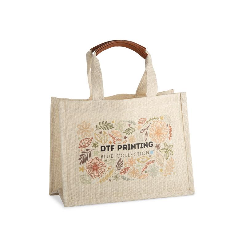 Torba jutowa JUNA to mniejsza wersja klasycznej torby plażowej – lekka, poręczna i idealna na letnie dni. Sprawdzi się jako mała torba na zakupy lub codzienna torebka o naturalnym charakterze. Wnętrze z podszewką i praktyczną kieszonką na zamek ułatwia organizację drobiazgów, a krótkie, płaskie uchwyty wzmocnione materiałem skóropodobnym (PU) zapewniają wygodne noszenie. Naturalna faktura juty i prosty nadruk nadają jej wakacyjnego stylu.