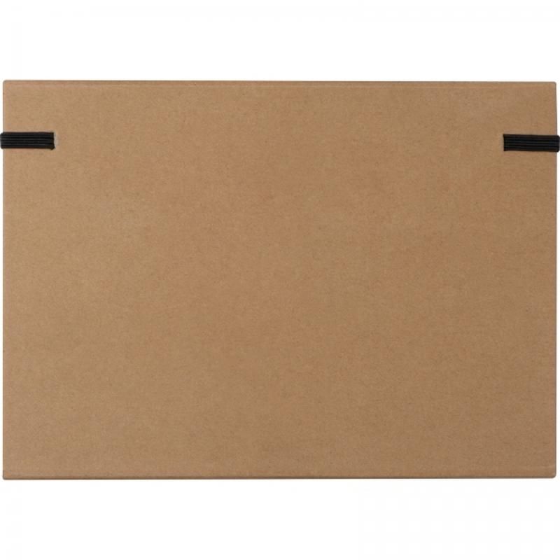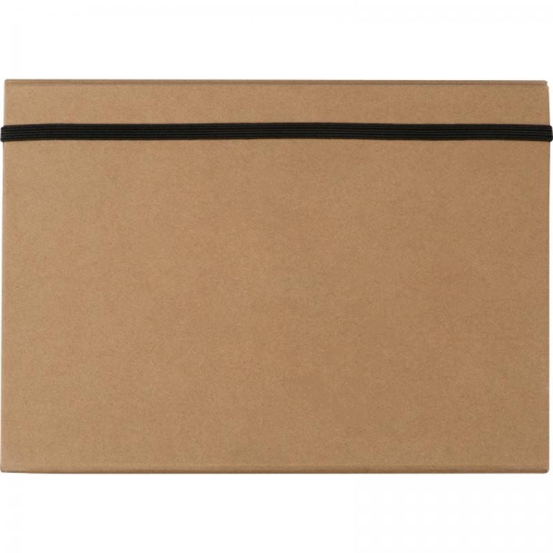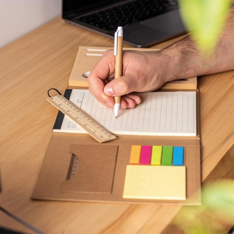 Podwójnie składany, zamykany na gumkę tekturowy folder zawiera: 80-stronicowy notes w linie, 20 kolorowych samoprzylepnych karteczek w 5 kolorach, żółte karteczki, dwie linijki (w tym jedna drewniana), długopis, drewnianą temperówkę, gumkę do ścierania i dwa ołówki.