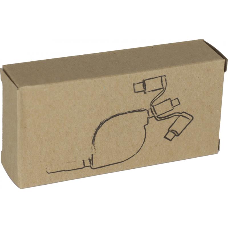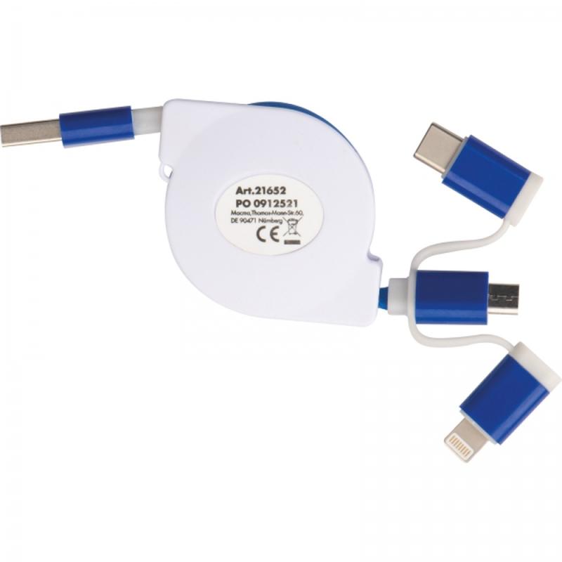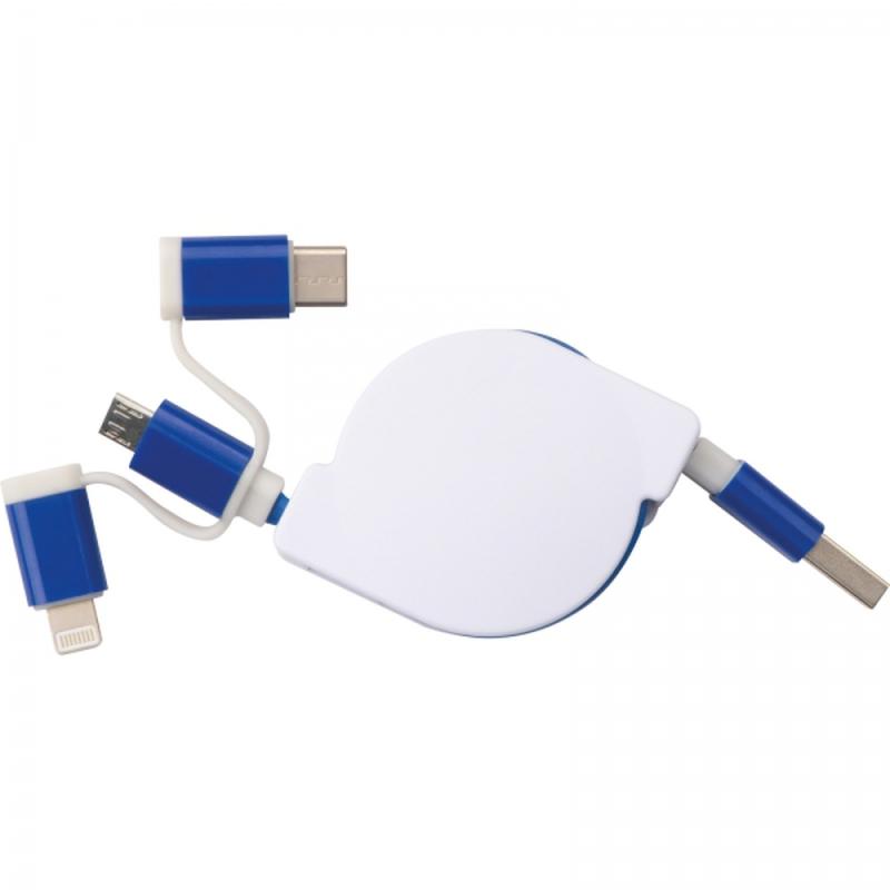 Rozwijany kabel do ładowania 3w1 w plastikowej obudowie z wtyczką USB i 3 złączami: iOS, C-Type i Micro USB.