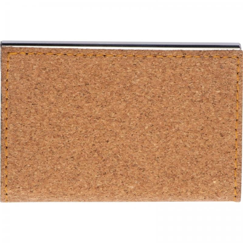 Wizytownik z metalu w korkowej obudowie, zamykany na magnetyczny zatrzask, z materiałową wyściółką.