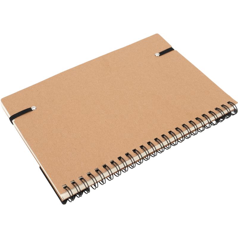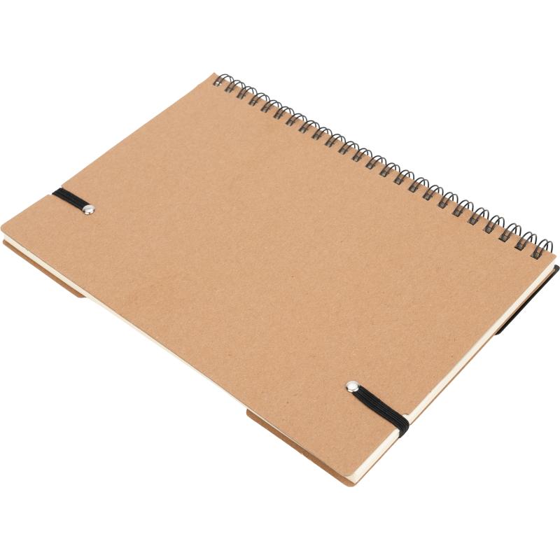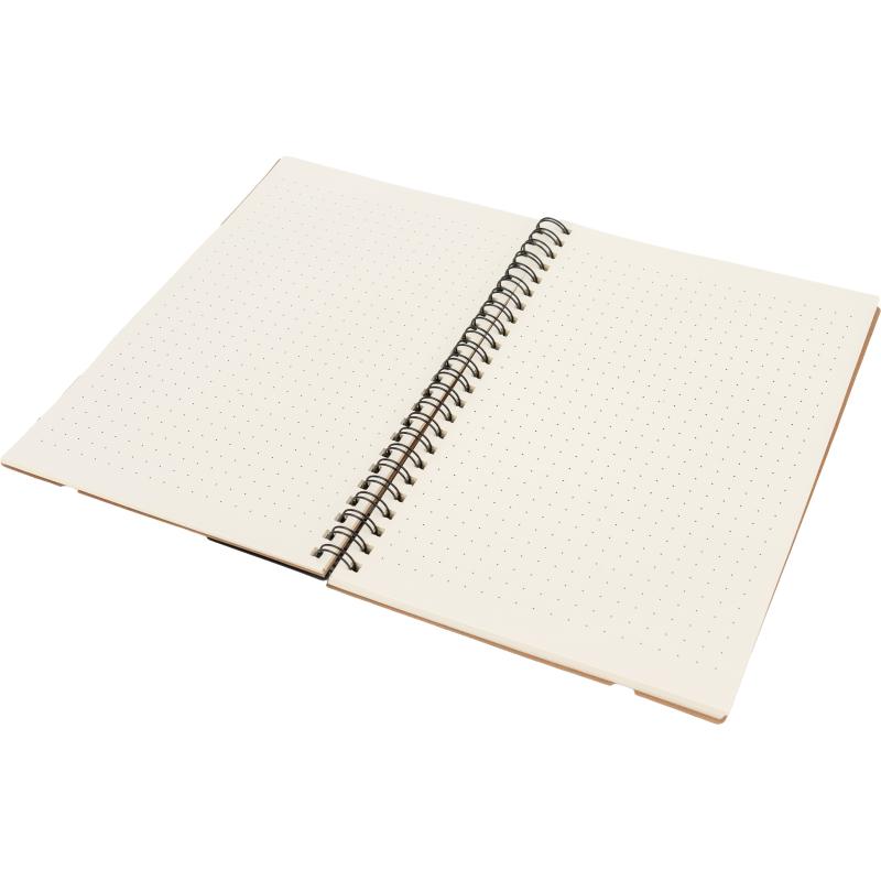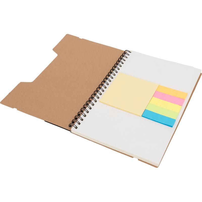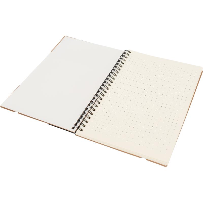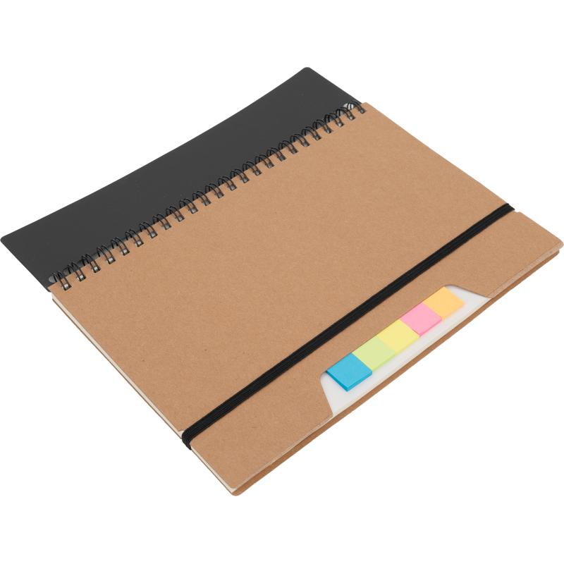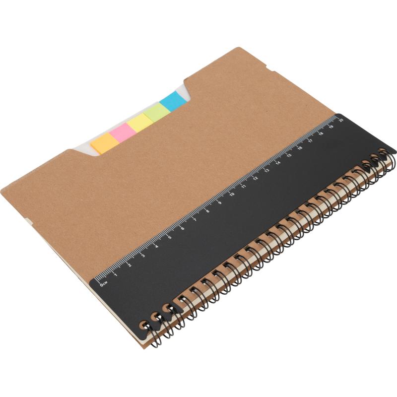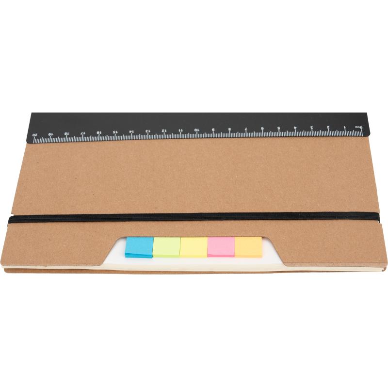 Notes A5 w kartonowej okładce z plastikową linijką, 120 stronami w kropki, karteczkami samoprzylepnymi i zamknięciem na gumkę.