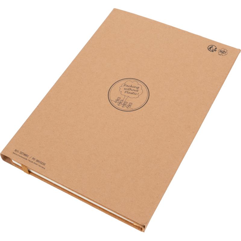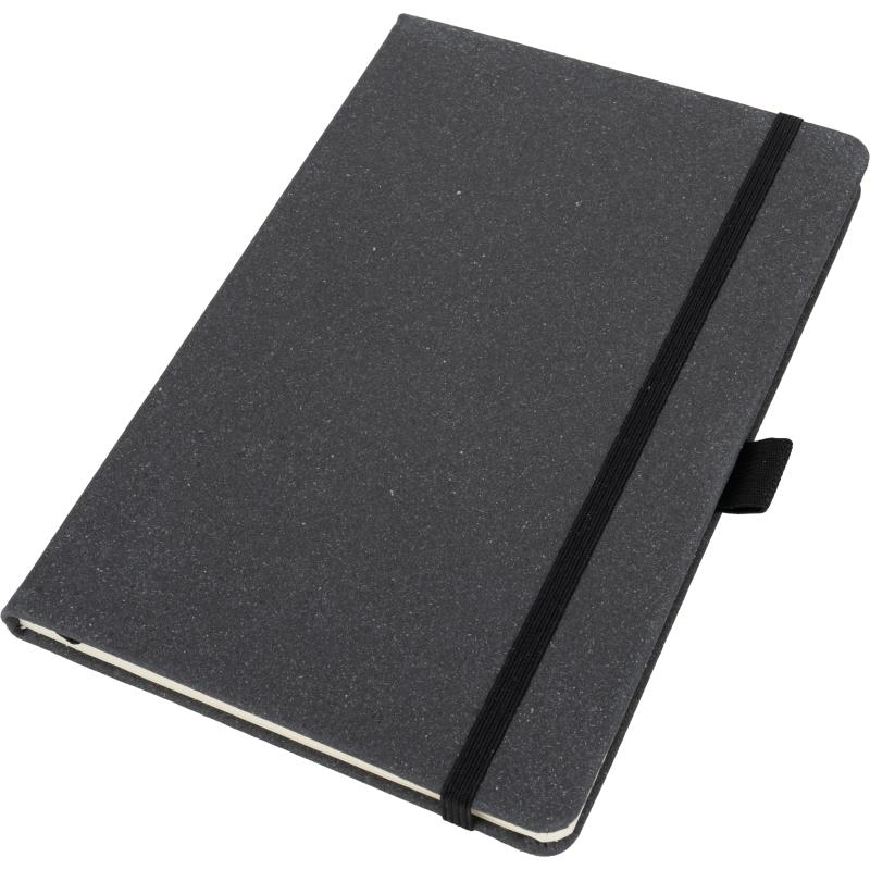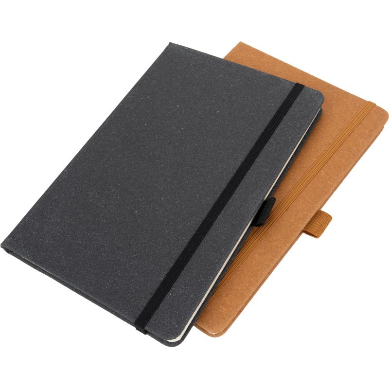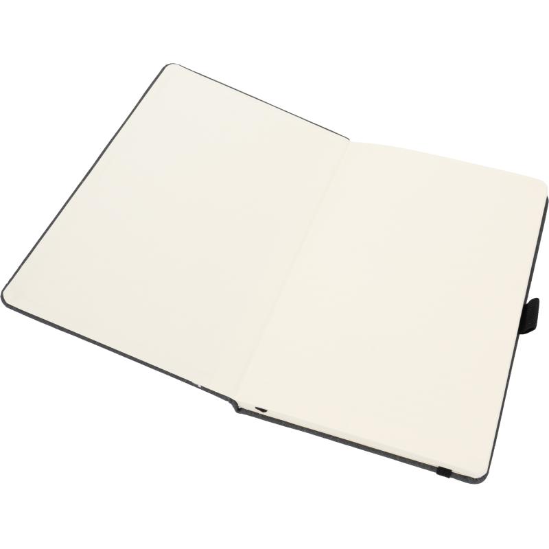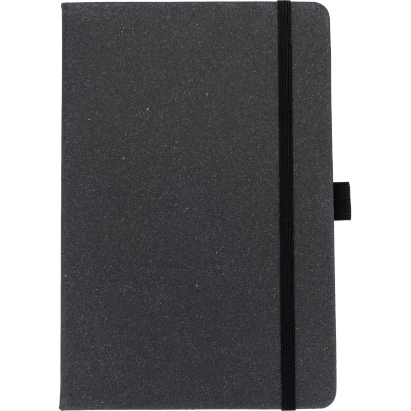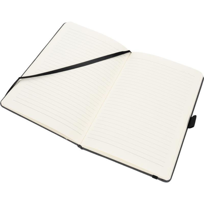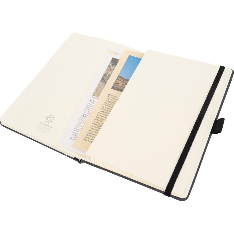Notes o formacie A5, wykonany ze skóry pochodzącej z recyklingu z zamknięciem na gumkę. Wewnątrz znajduje się 160 kartek w linie.
