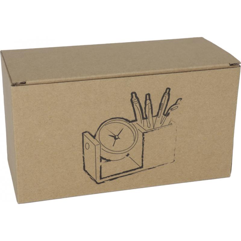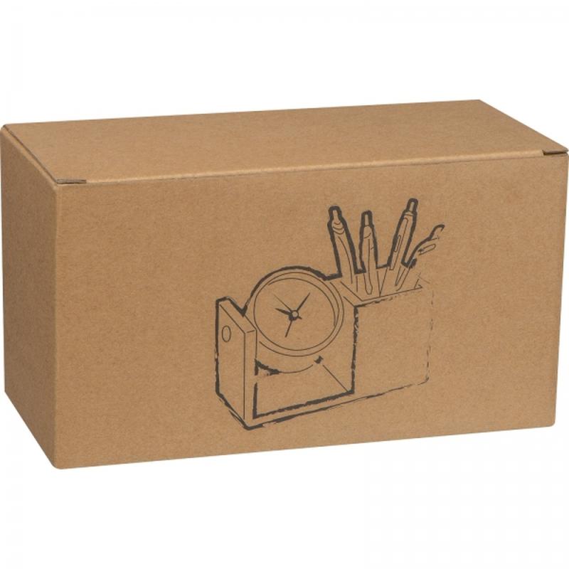 Aluminiowy zegar obrotowy umieszczony na drewnianej podstawce, wyposażonej w pojemnik na artykuły piśmiennicze.