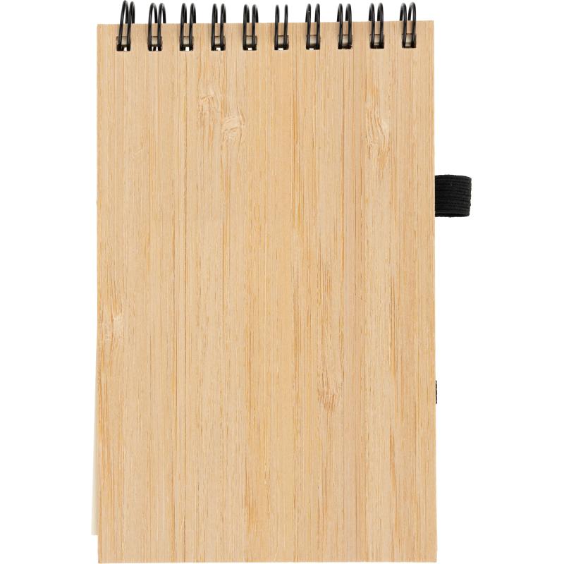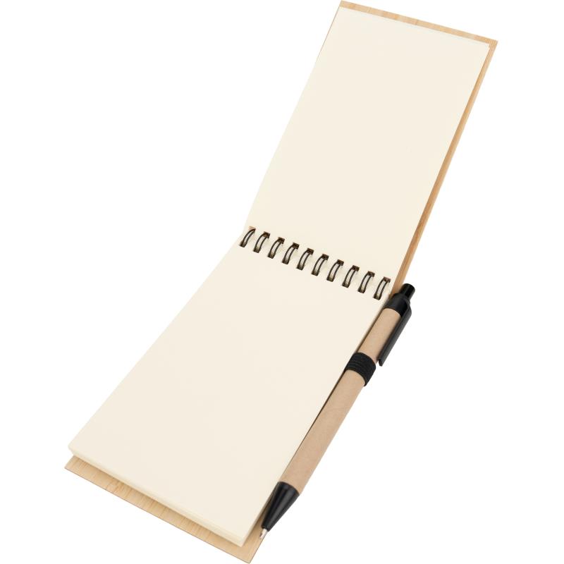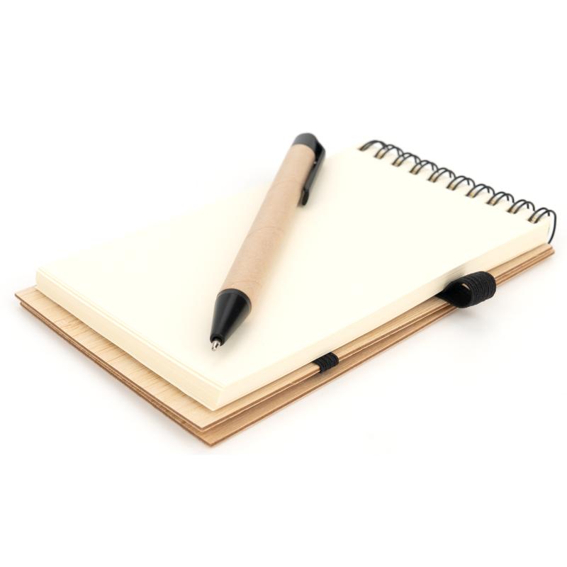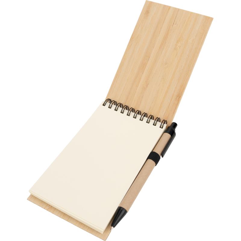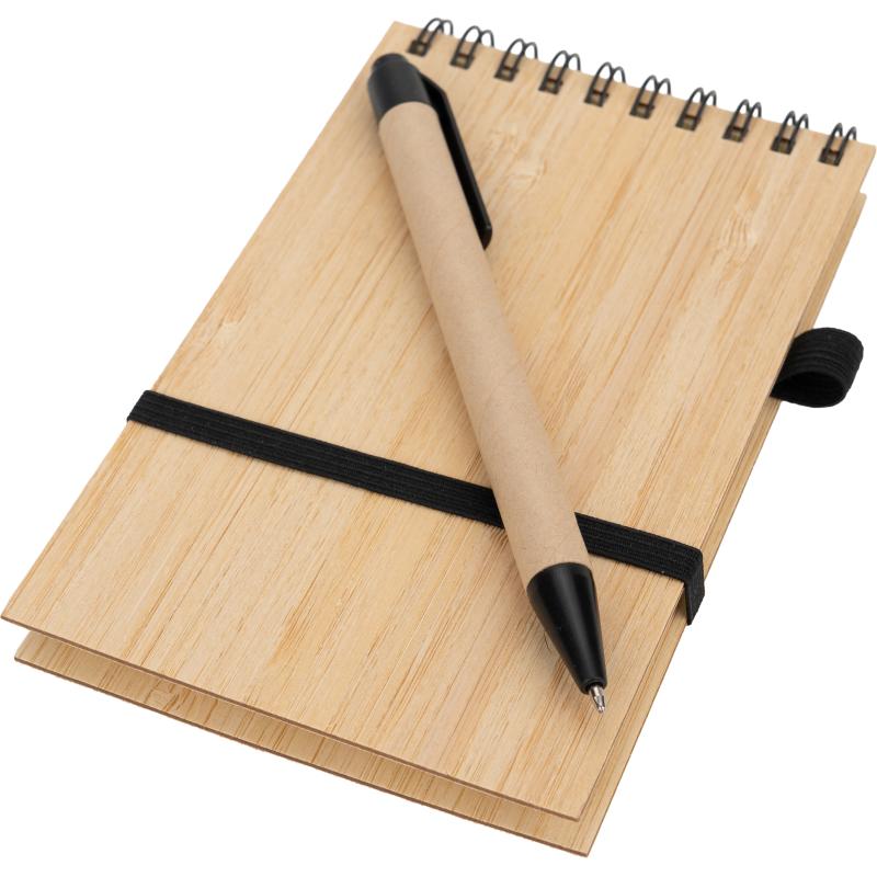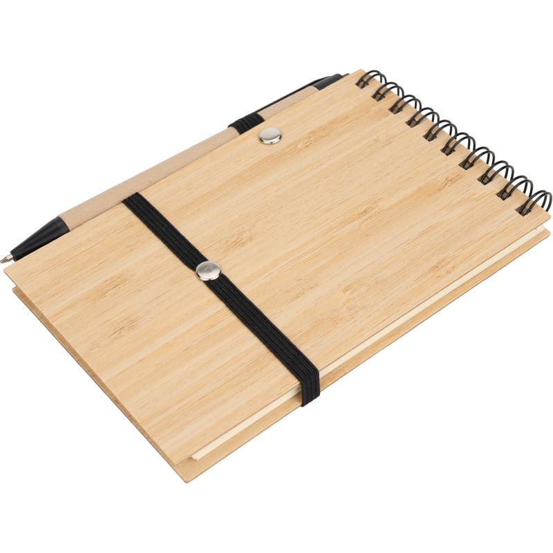 Notes o formacie A6 z bambusową okładką, zamykany na gumkę. Notes posiada 140 niezadrukowanych stron, dodatkowo wyposażony został w długopis, który dzięki pętelce przy notesie, zawsze będzie pod ręką.