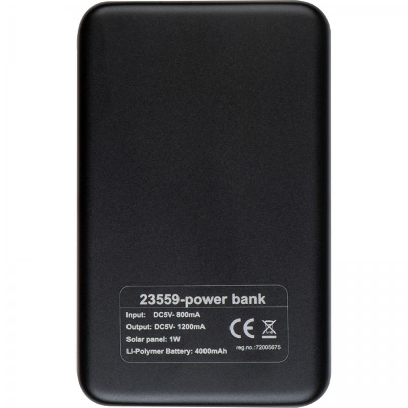 Power bank o pojemności 4000mAh, wykonany z metalu. Posiada funkcję Two Way Power (ładowanie solarne lub przez kabel USB). Dane techniczne: Input: DC5V-800mA Output: DC5V-1200mA Solar panel: 1W Pojemność: 4000mAh Ładowanie: micro USB podłączyć do komputera za pomocą USB A Inne: Dołączony kabelek ze złączami USB A i mikro USB