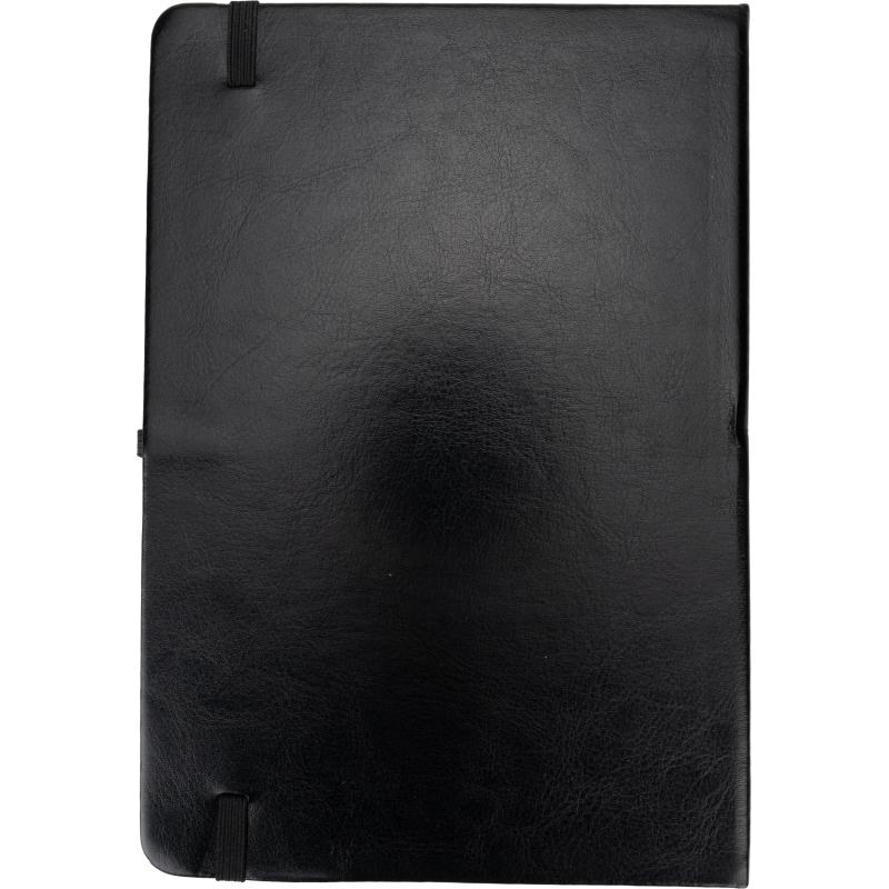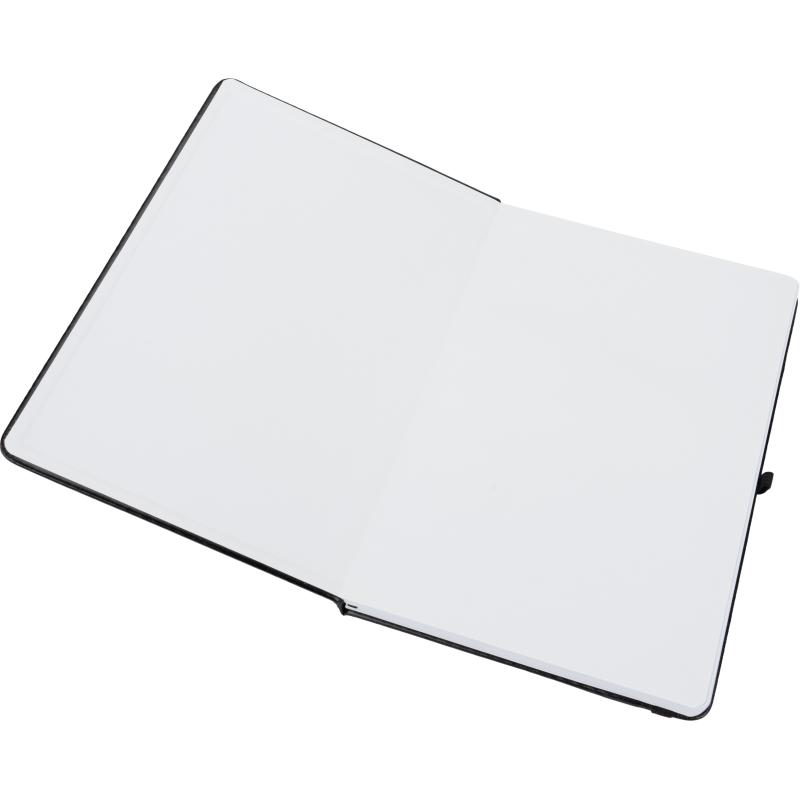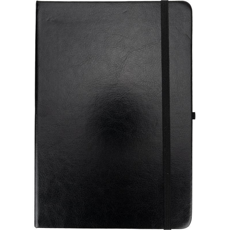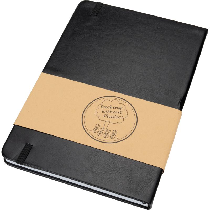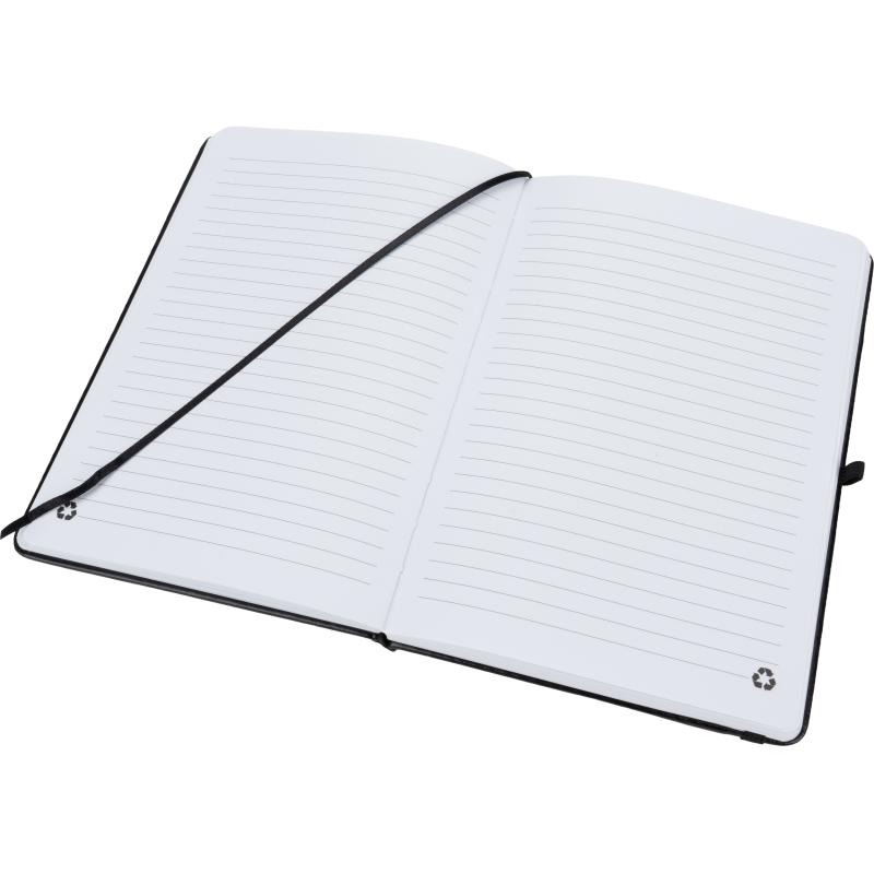 Notes o formacie A5, z okładką wykonaną z PU pochodzącego z recyklingu, posiada 192 strony w linie, zamknięcie na gumkę, materiałową zakładkę i pętelkę na długopis.