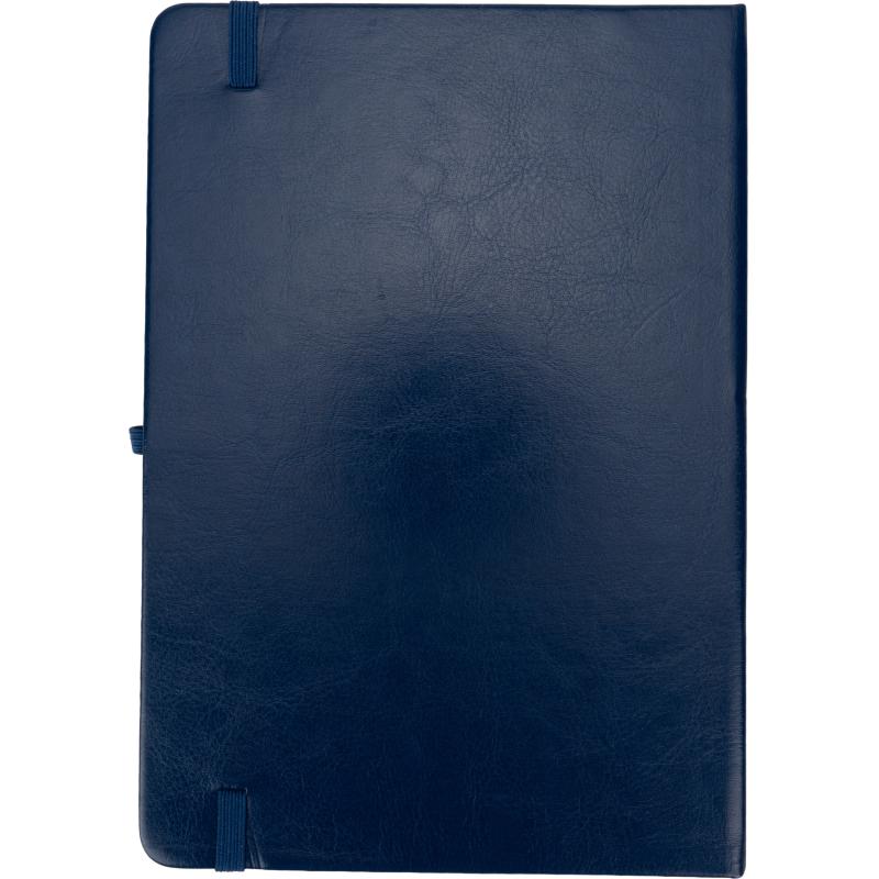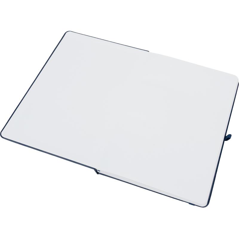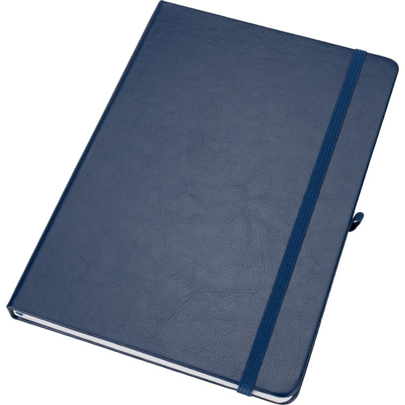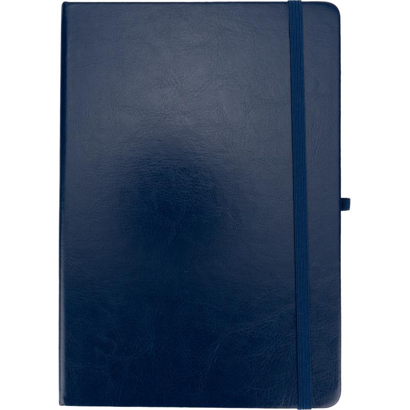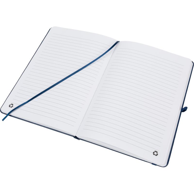 Notes o formacie A5, z okładką wykonaną z PU pochodzącego z recyklingu, posiada 192 strony w linie, zamknięcie na gumkę, materiałową zakładkę i pętelkę na długopis.
