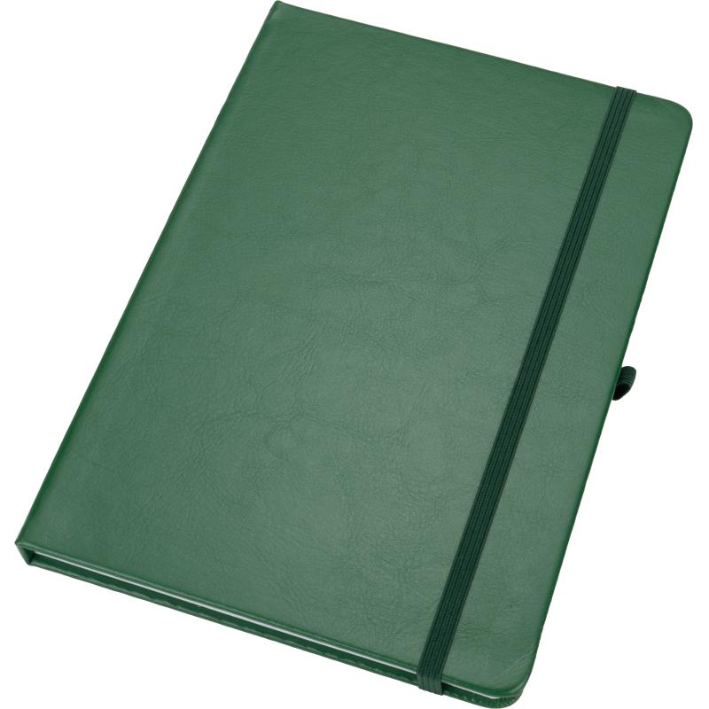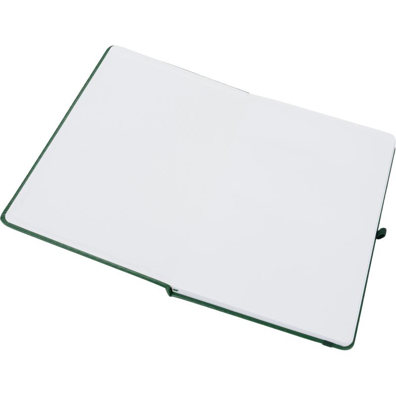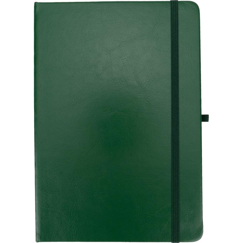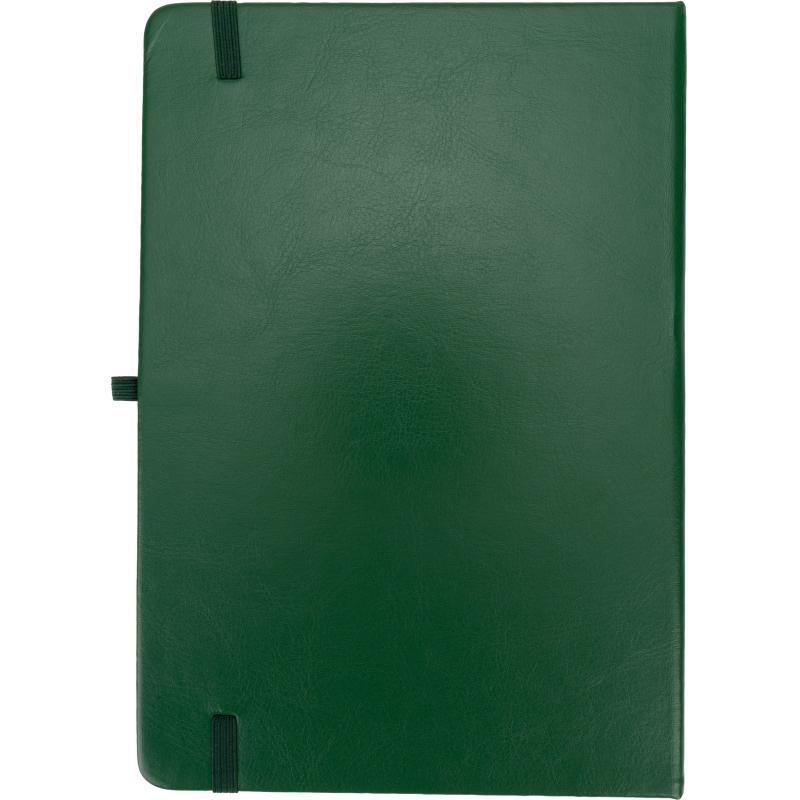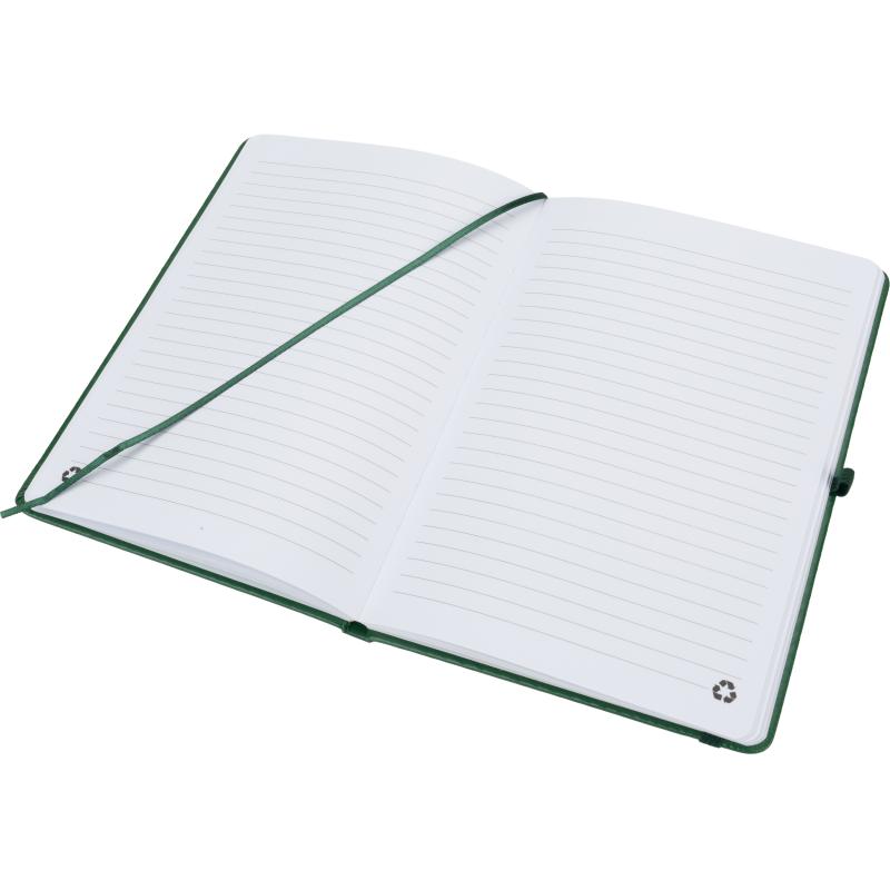 Notes o formacie A5, z okładką wykonaną z PU pochodzącego z recyklingu, posiada 192 strony w linie, zamknięcie na gumkę, materiałową zakładkę i pętelkę na długopis.